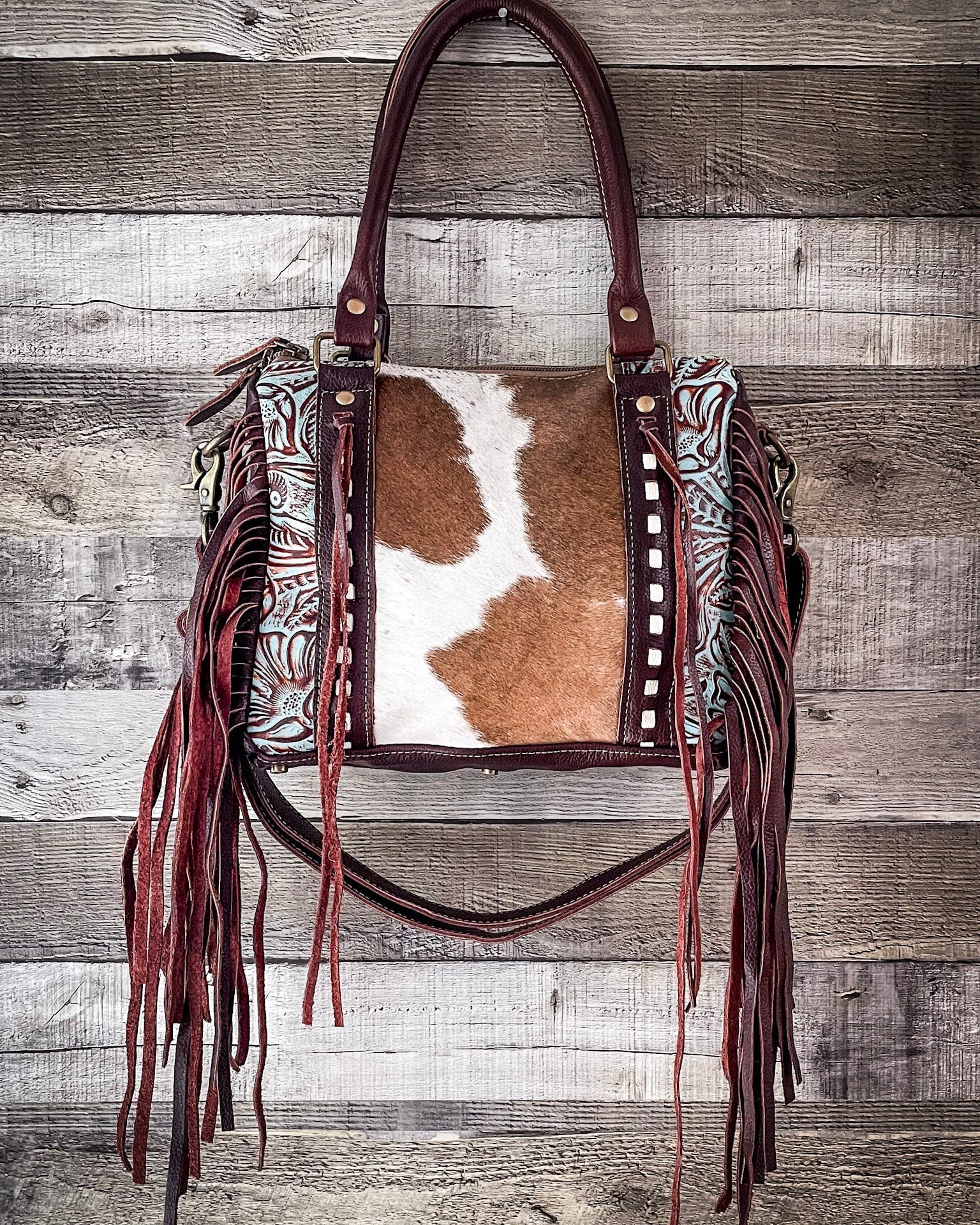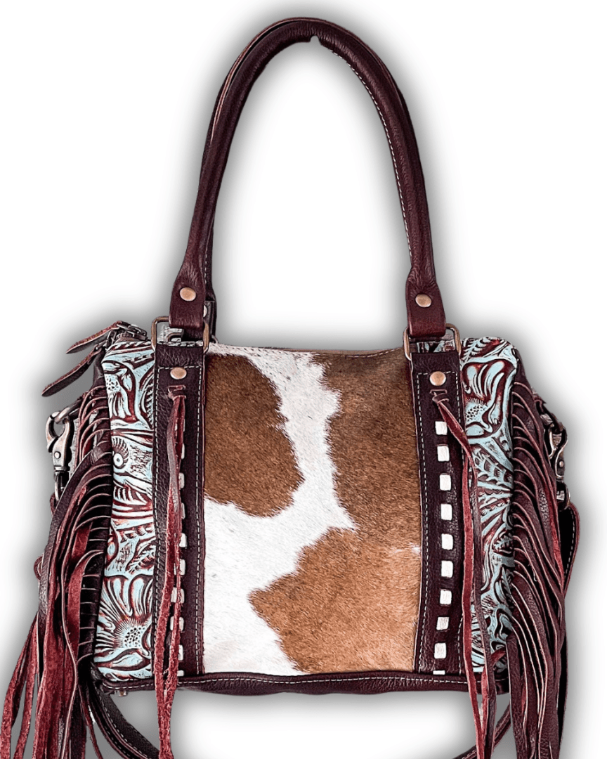 At the heart of this design is genuine hair-on-hide, framed by warm leather tones and turquoise-tooled side panels that give off an earthy, sun-washed energy. The hide front is completely unique from one bag to the next, adding a natural, grounded touch that feels raw and real. Long, rich brown fringe spills down each side, adding movement and drama in every step.