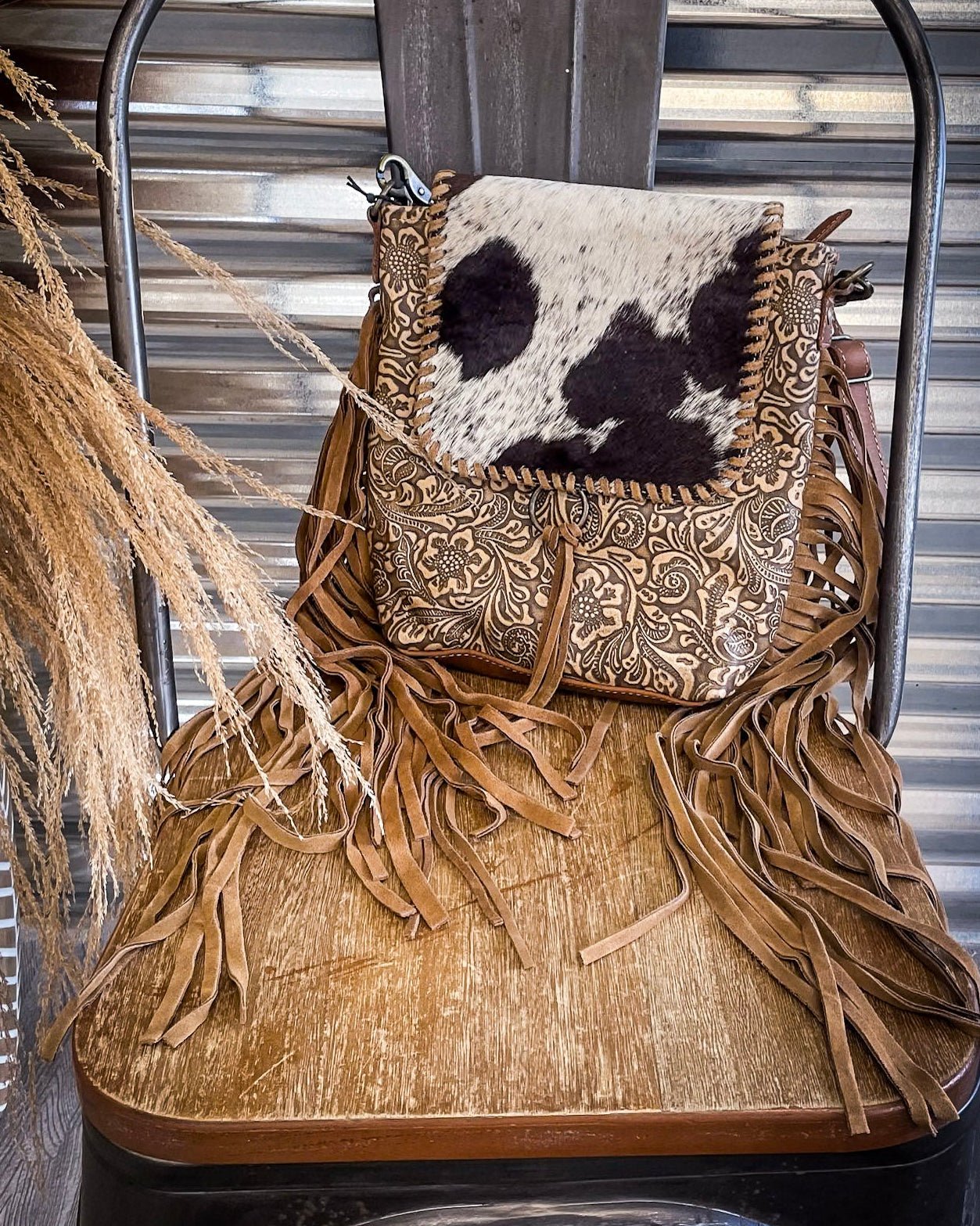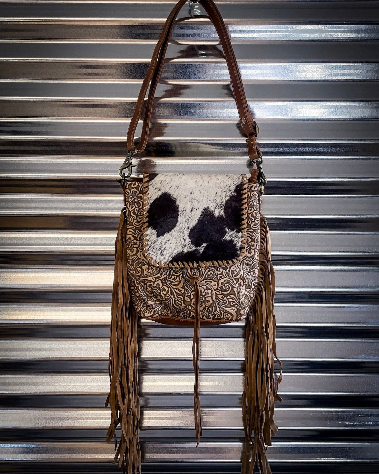 Crafted with genuine hair-on-hide, floral-embossed leather, and dramatic fringe, this crossbody blends artisan beauty with everyday practicality. The flap features bold patches of natural hide, each one completely unique in tone and pattern. It sits above a richly embossed leather body, with a floral paisley design that gives this bag a romantic, vintage feel.