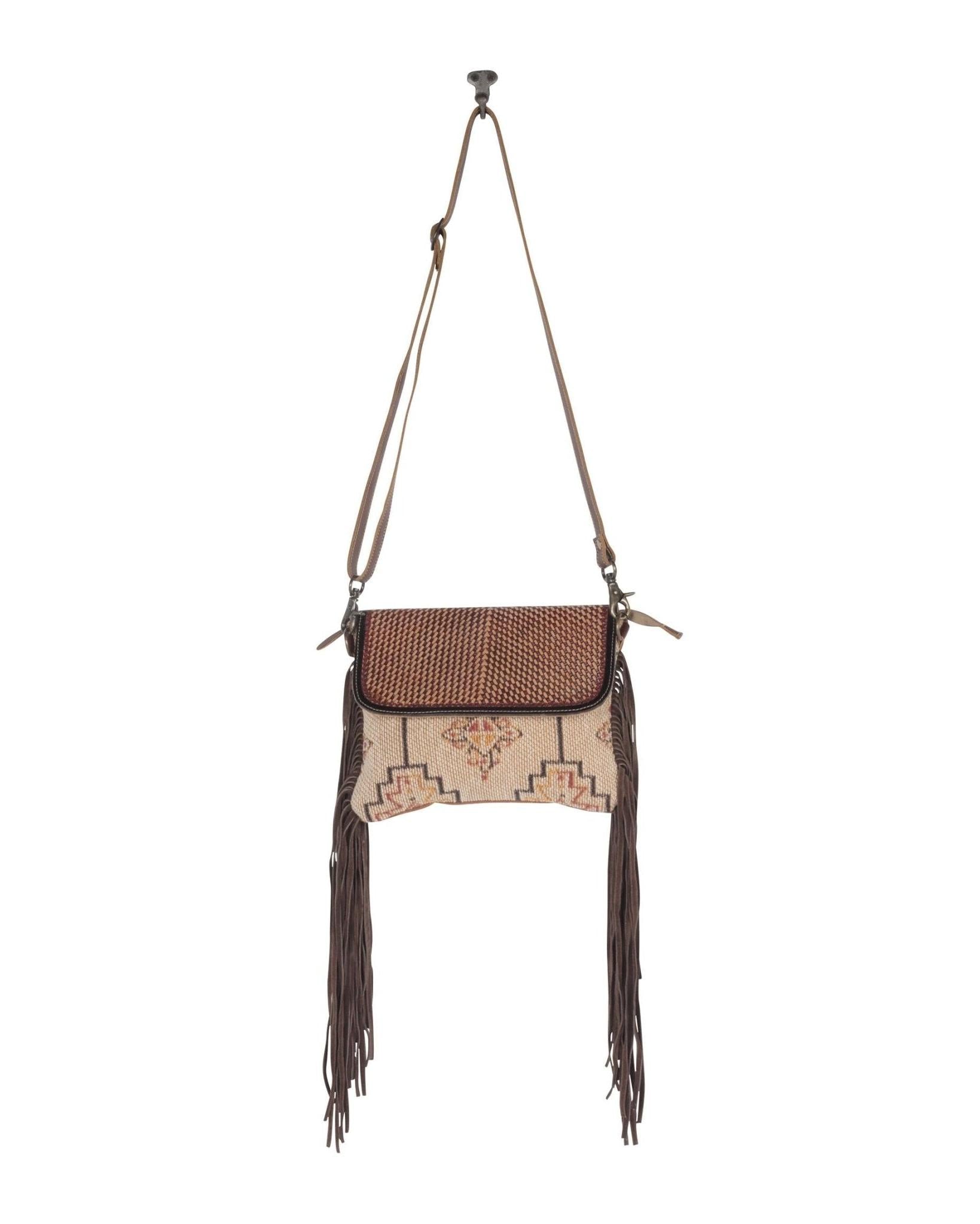 The body of the bag features a sturdy woven fabric in a sandy beige tone, adorned with warm, rust-colored geometric patterns that echo traditional Native motifs. Each woven design adds depth and movement, as if painted by the desert wind itself. The muted colors are calming and earthy, making the bag an easy complement to any wardrobe, whether you’re dressing up for an evening gathering or heading out on a casual weekend adventure.