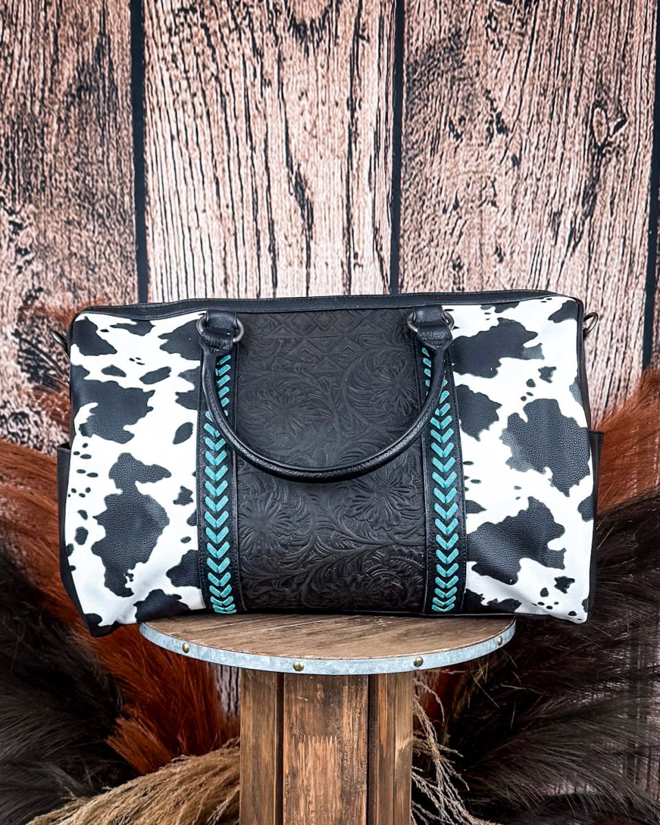 The Ranch Road Duffle Bag by Montana West is made for weekends away, rodeo runs, or just hauling it all in style. With classic black-and-white cow print panels and a bold tooled center design, this bag doesn’t just show up—it makes a statement. Turquoise whipstitch accents give it that extra pop of personality, while the spacious interior, double carry handles, and zip-top closure keep it practical and easy to grab and go. Whether you're packin’ light or bringing the whole dang closet, Ranch Road is ready to roll.