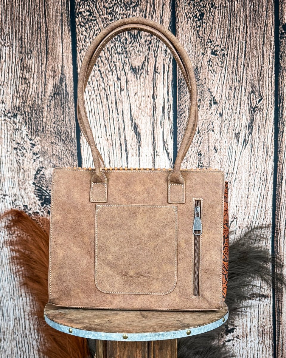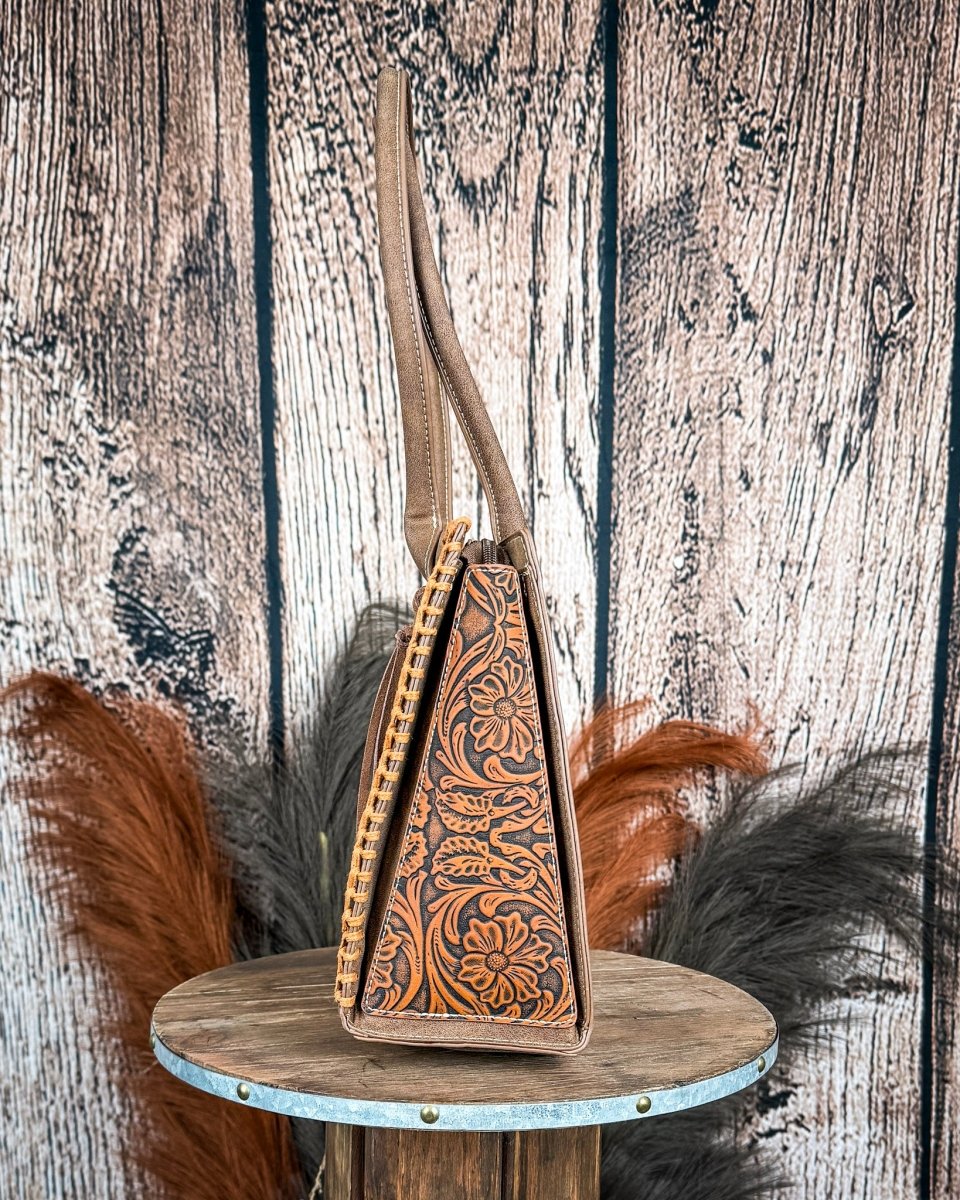 The Rowena tote brings together timeless tooling and everyday functionality in a refined, structured silhouette. Crafted from durable PU leather, this Montana West design features vintage floral tooling across the front and sides, accented with whipstitch edging and soft tassel details. The warm brown tone complements the intricate patterning, giving the bag an elevated look that pairs effortlessly with denim, workwear, or travel outfits. Double handles with a comfortable 10-inch drop make it easy to carry throughout the day.