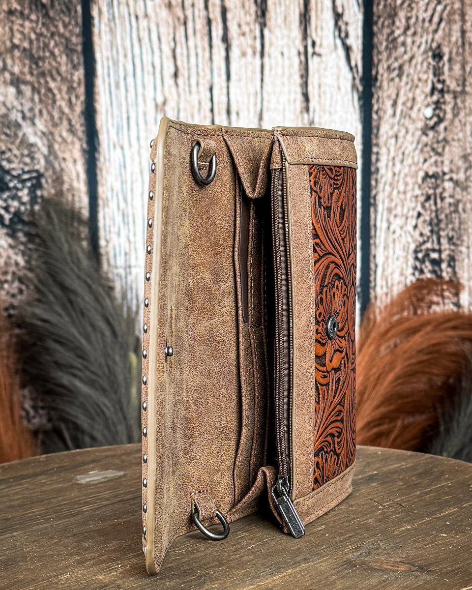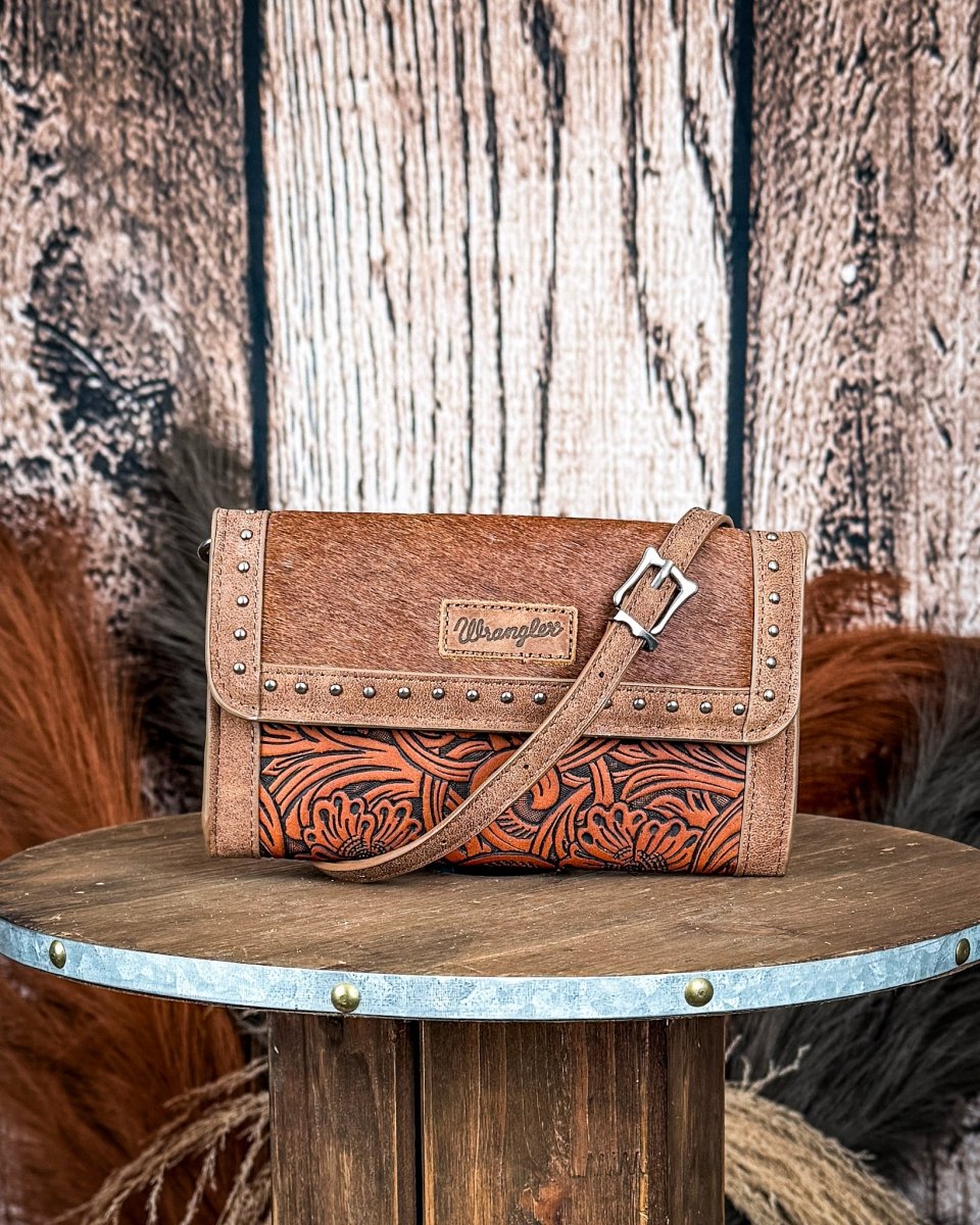 This Wrangler wallet crossbody is designed for everyday versatility with an elevated Western feel. Crafted to function as a wallet, wristlet, or crossbody, this compact style keeps essentials organized without sacrificing style. The genuine hair-on cowhide front brings natural texture and one-of-a-kind character to each piece.