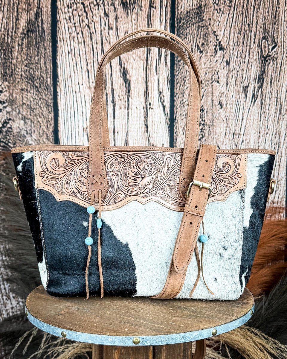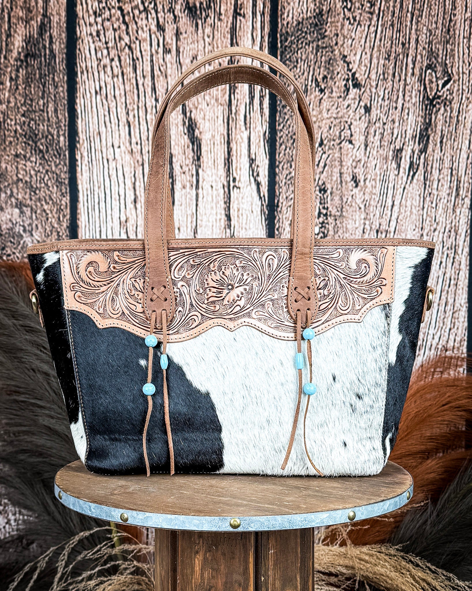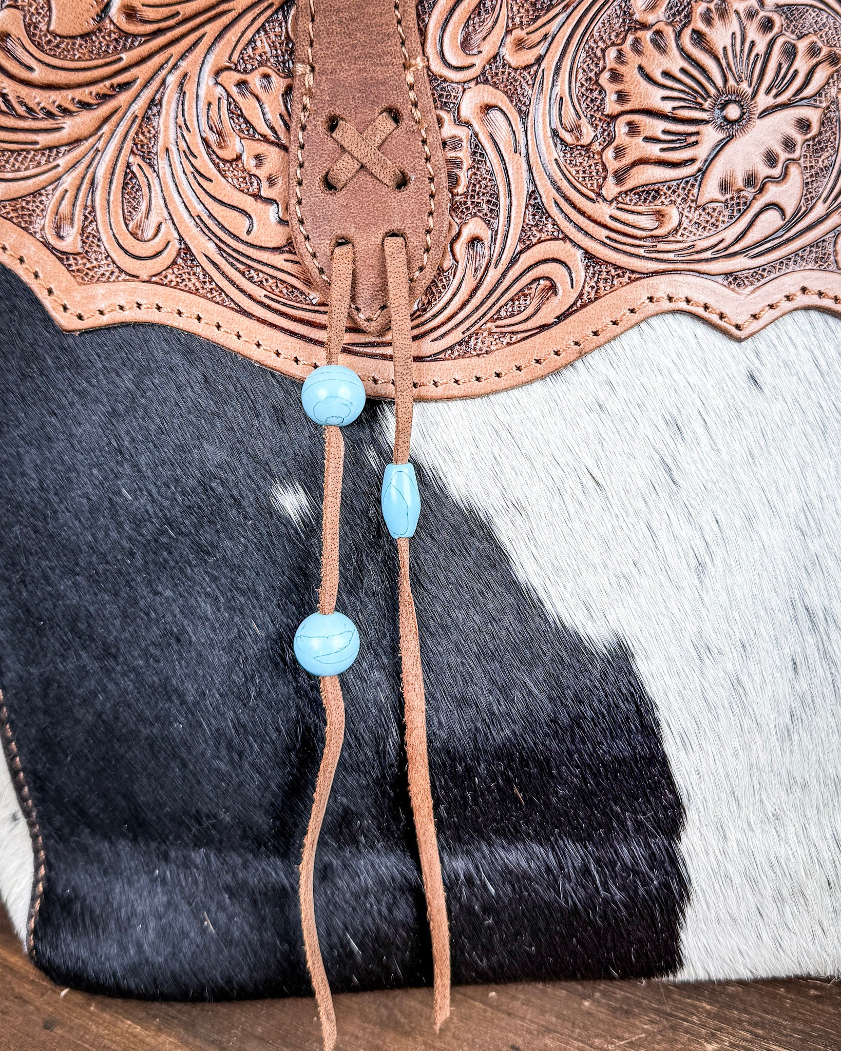 The Hearthwind Handtooled Bag in Onyx Frost by Myra Bag is the kind of statement tote that still feels effortless. Bold hair-on cowhide gives every bag its own one-of-a-kind pattern, while the scalloped, hand-tooled leather panel across the top brings in that classic Western craftsmanship you can dress up or down. Finished with turquoise colored bead accents on the leather tassels, Hearthwind adds a clean pop of color without feeling loud.