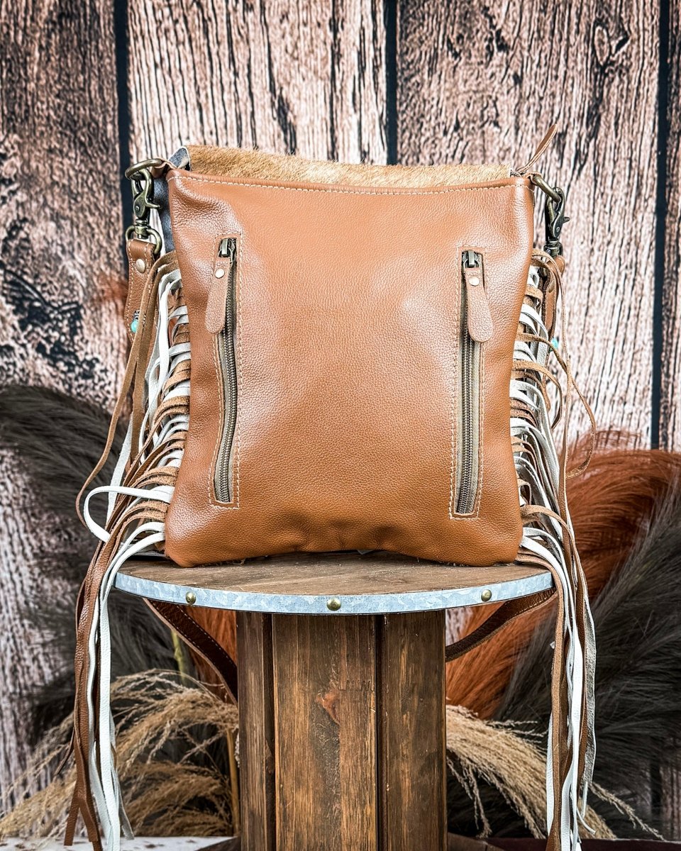 The Mesa Concealed Carry Bag in Prairie Fawn by Myra is designed for women who want functional security paired with understated, well-crafted style. Made from genuine leather and hair-on cowhide, this bag features a brown and white spotted hide flap that adds natural texture without overpowering the design. Each piece of cowhide is unique, making every bag one of a kind.
