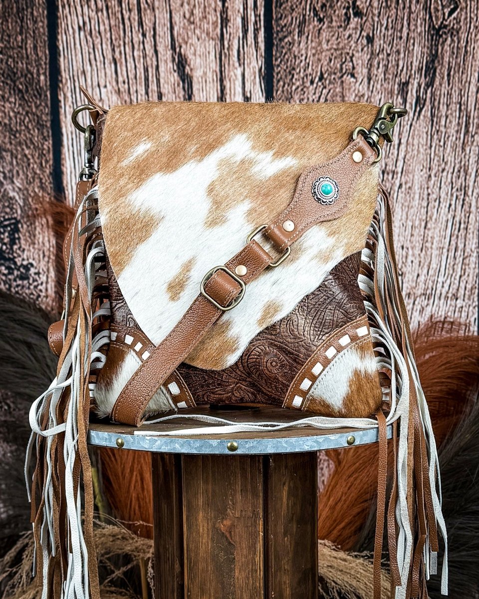 • The Mesa Concealed Carry Bag in Prairie Fawn by Myra is designed for women who want functional security paired with understated, well-crafted style. Made from genuine leather and hair-on cowhide, this bag features a brown and white spotted hide flap that adds natural texture without overpowering the design. Each piece of cowhide is unique, making every bag one of a kind.