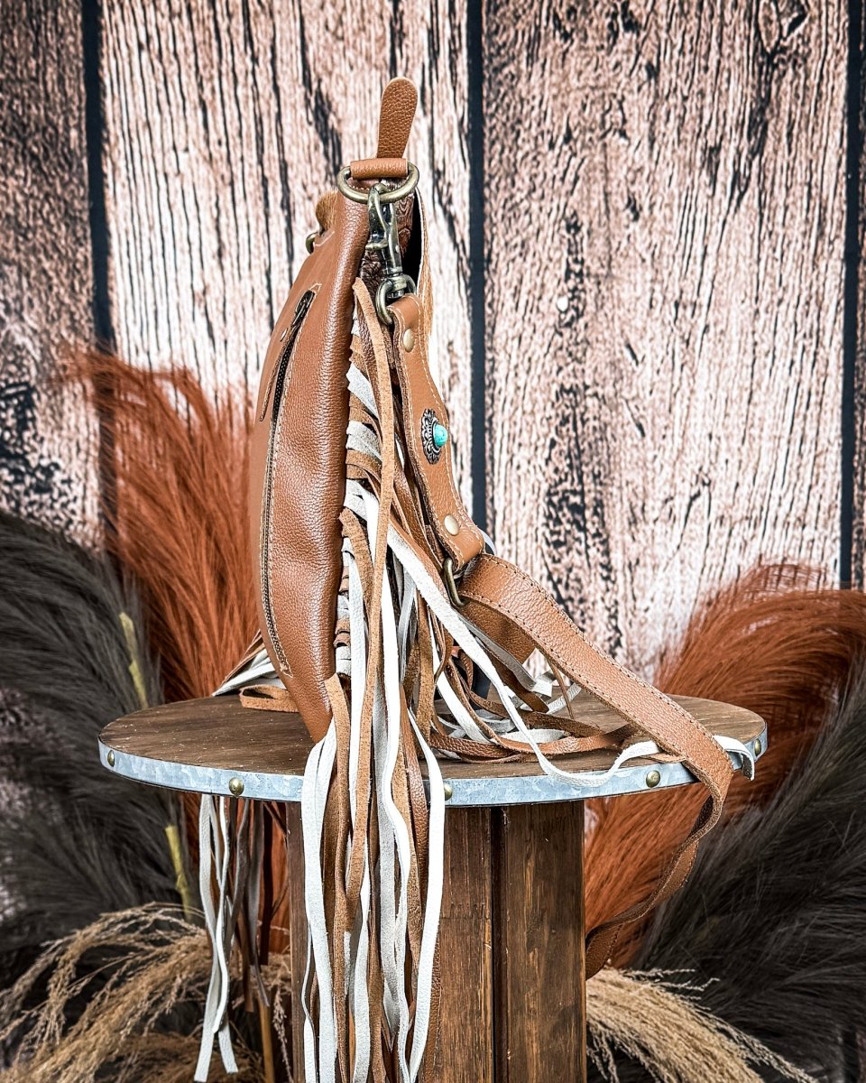 The structured leather body is softened with subtle embossing and long fringe that adds movement while keeping the overall look balanced and wearable. Its slightly vertical shape offers a compact profile that sits comfortably against the body, making it ideal for everyday use. An adjustable strap allows for easy crossbody wear and hands-free convenience.