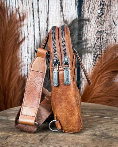 Sleek, rugged, and ready for adventure — the Wrangler Outlaw Sling Bag brings a bold western edge to everyday carry. Crafted from durable vegan leather in a rich saddle brown hue, this compact bag keeps your essentials close and your hands free. The adjustable Wrangler logo strap offers a comfortable, custom fit whether worn crossbody or over the shoulder. With its practical zippered compartments and timeless western style, this sling bag is built for life on the go.