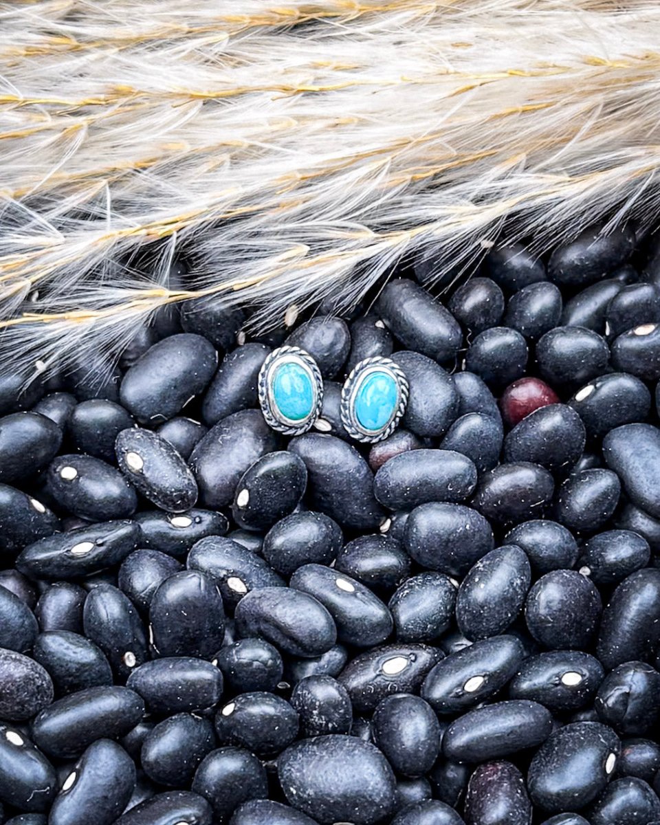 Each earring features an oval turquoise stone, measuring approximately 8 x 5.5 mm, framed with a delicate silver rope detail for just the right amount of texture. Because these are natural stones, no two pairs are ever exactly alike—each one carries its own unique shade of blue and natural veining.