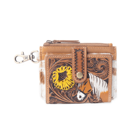 Right up front, you're greeted with a hand-tooled leather panel that’s nothing short of a work of art. A soft sunflower in bold yellow blooms beside a sketched horse profile, adding a heartfelt, nostalgic feel that nods to life out west. Set against warm caramel leather and accented with delicate hand stitching, the intricate floral and horse motif brings this wallet to life in a way that feels both rustic and one-of-a-kind.