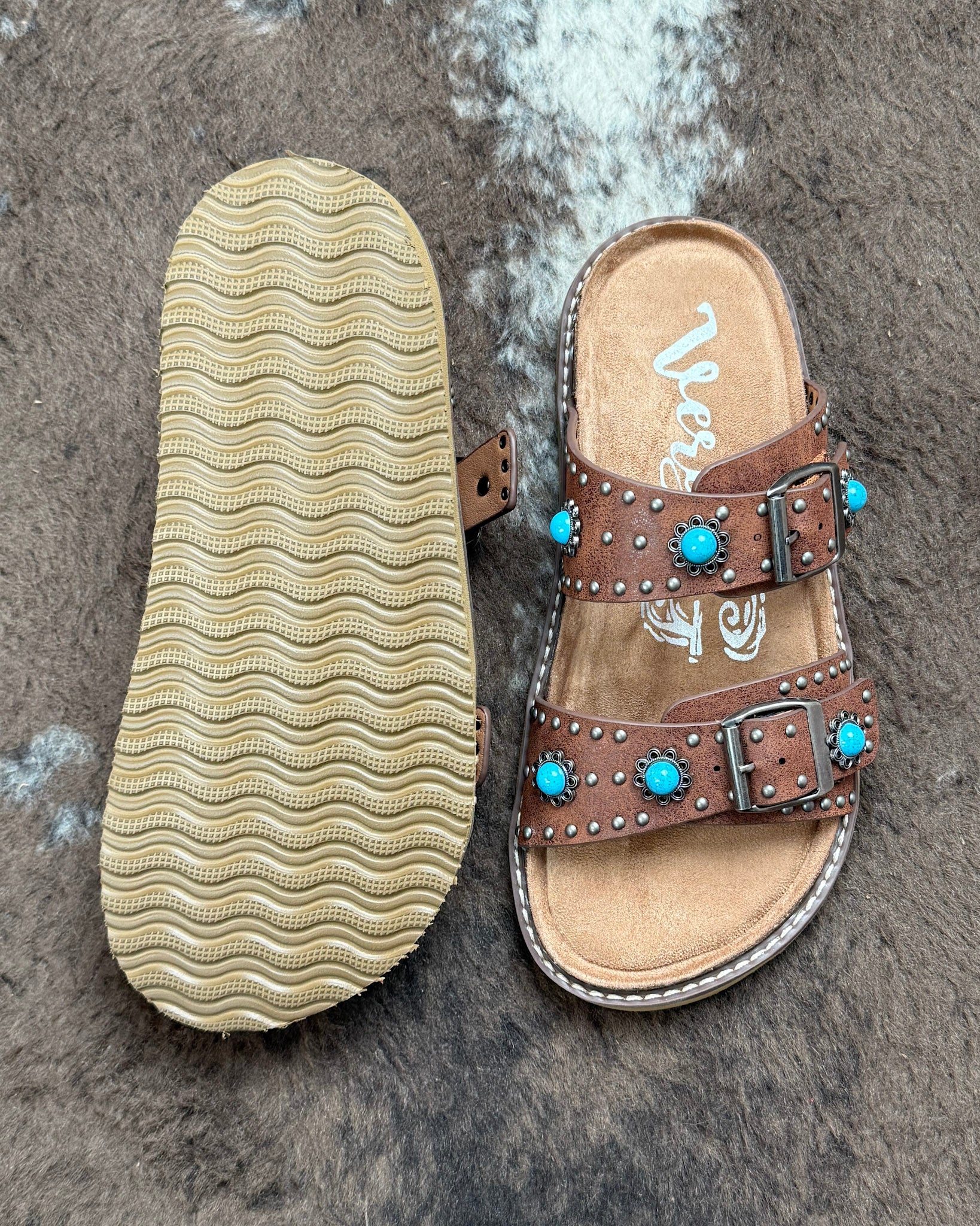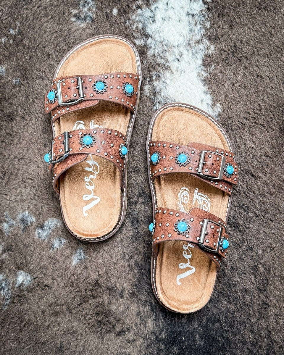 The Connie Concho Sandal in Tan by Very G blends rich texture with bold western detail for an effortlessly styled everyday look. Designed with a faux leather upper, this open toe sandal features decorative concho hardware, stud accents, and faux turquoise stones that add eye-catching character without feeling overdone.