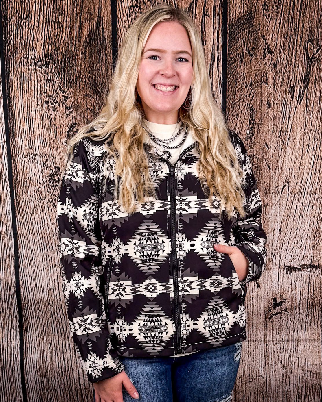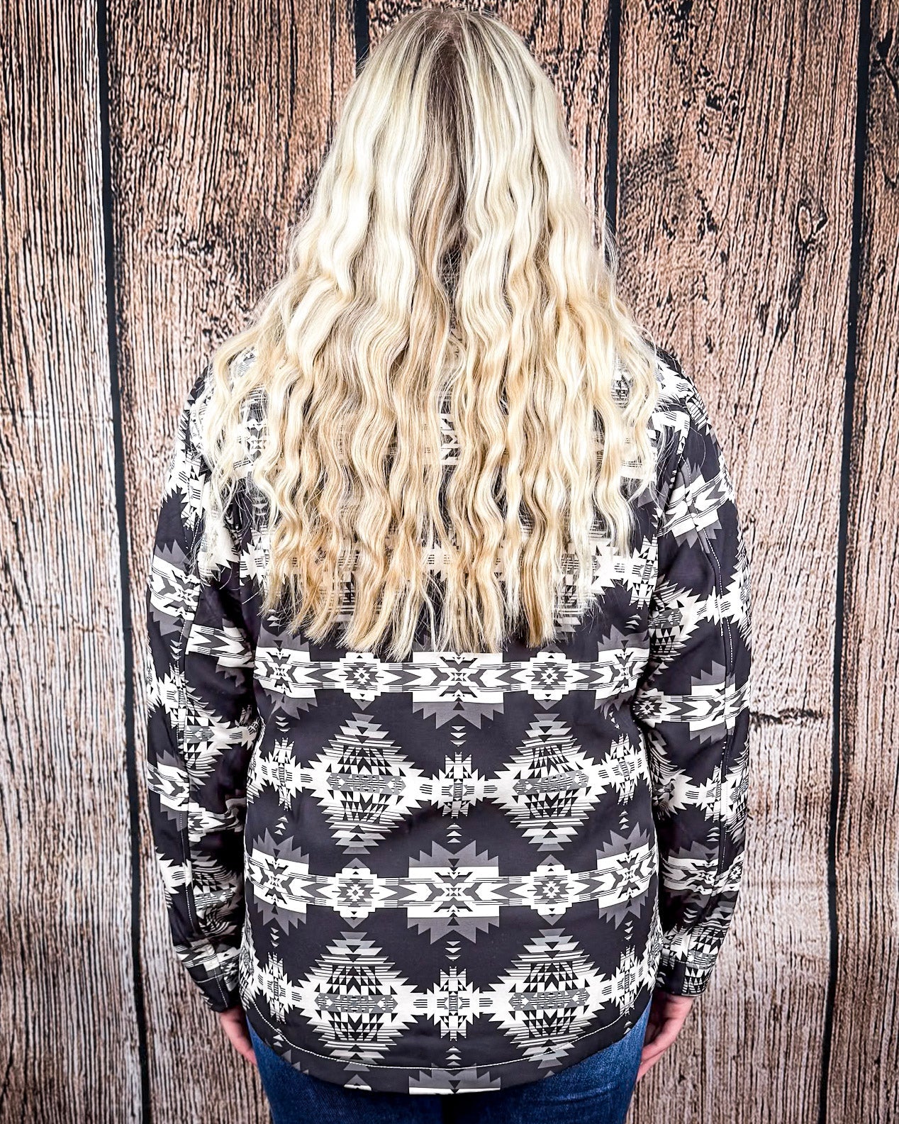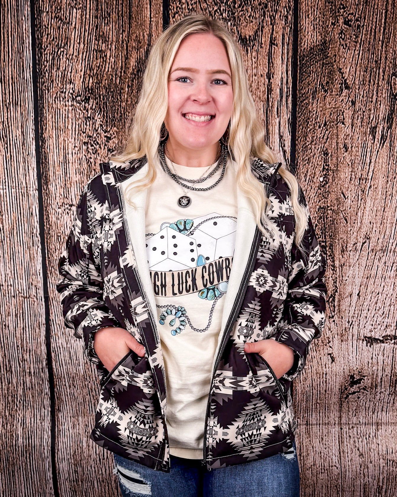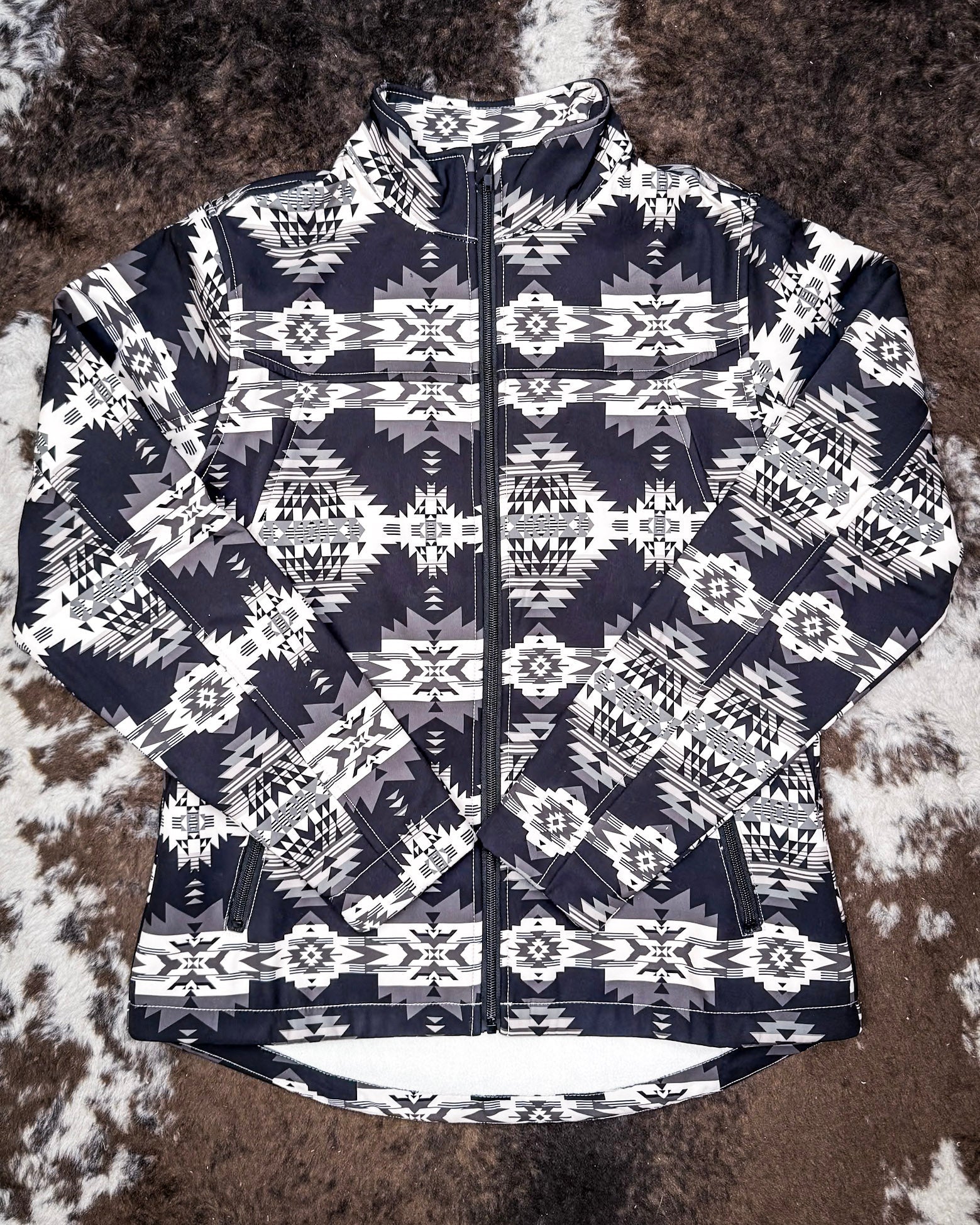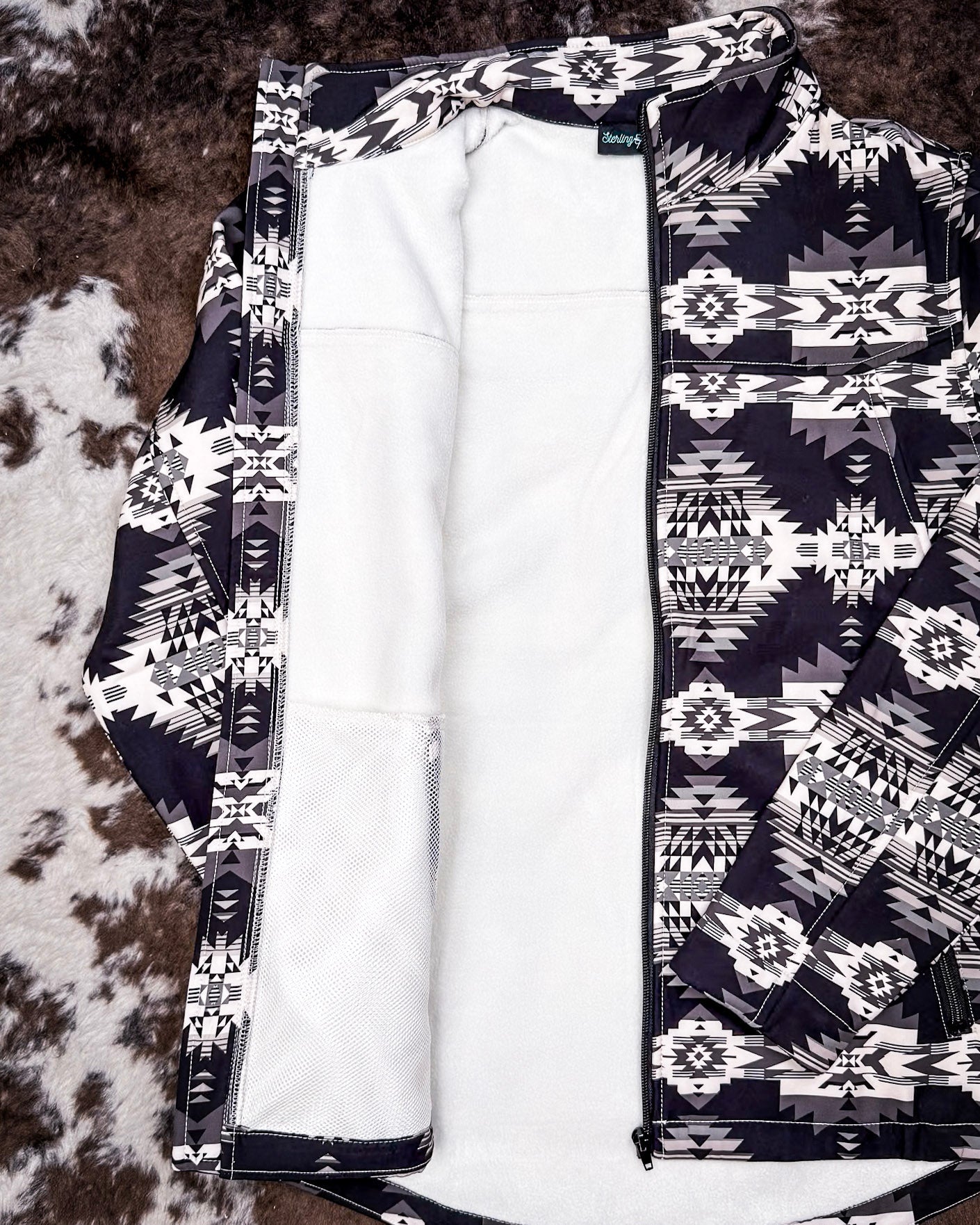The exterior features a sleek black shell, accented with a cream and gray Aztec pattern that gives the jacket its signature look. It’s a design that feels artistic yet versatile, perfect for everyday wear, city outings, or western-inspired looks with a modern twist.