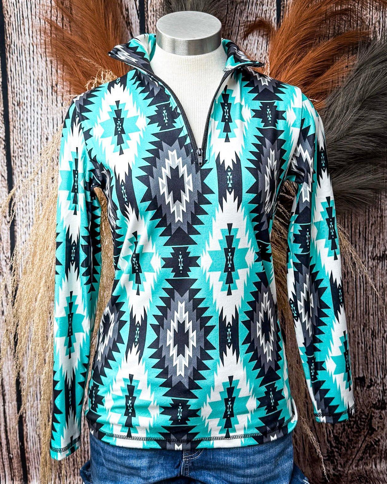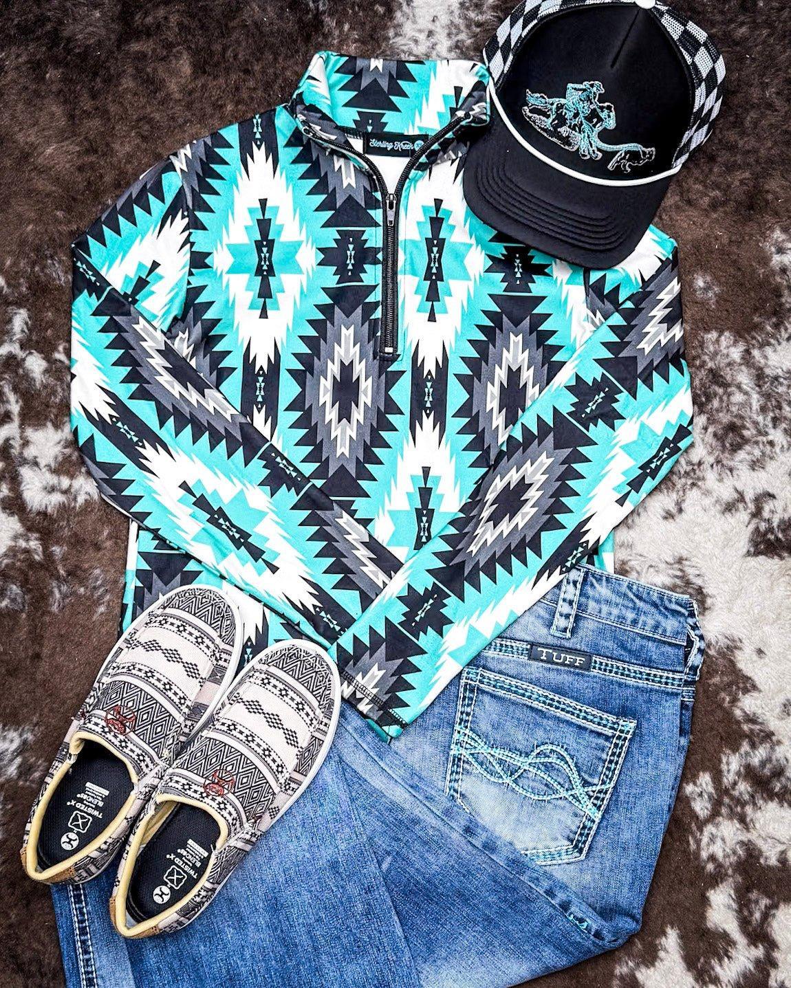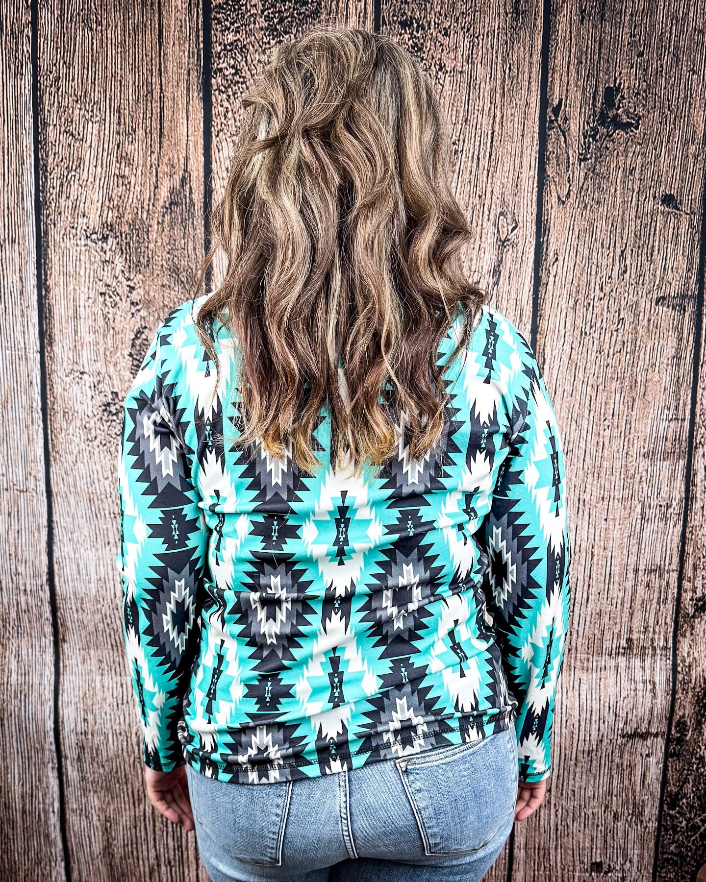 Featuring a bold turquoise, black, white, and charcoal Aztec pattern, this top brings major style without sacrificing comfort. The colors are rich but grounded, making it easy to pair with denim, joggers, or your favorite leggings. It’s got that eye-catching western vibe we all love without feeling too loud or over-the-top.