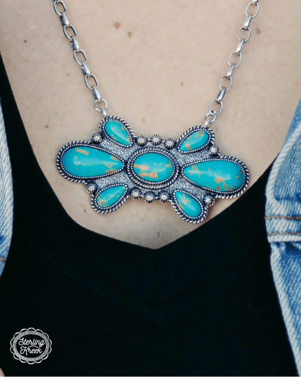 Bold. Playful. Unexpected. The Bullseye Fashion Necklace isn’t just another turquoise piece—it’s a standout blend of western soul and statement-making style. With its wide oval-and-teardrop shaped stones and chunky paperclip chain, this necklace delivers all the drama in a silhouette that still feels grounded and easy to wear.