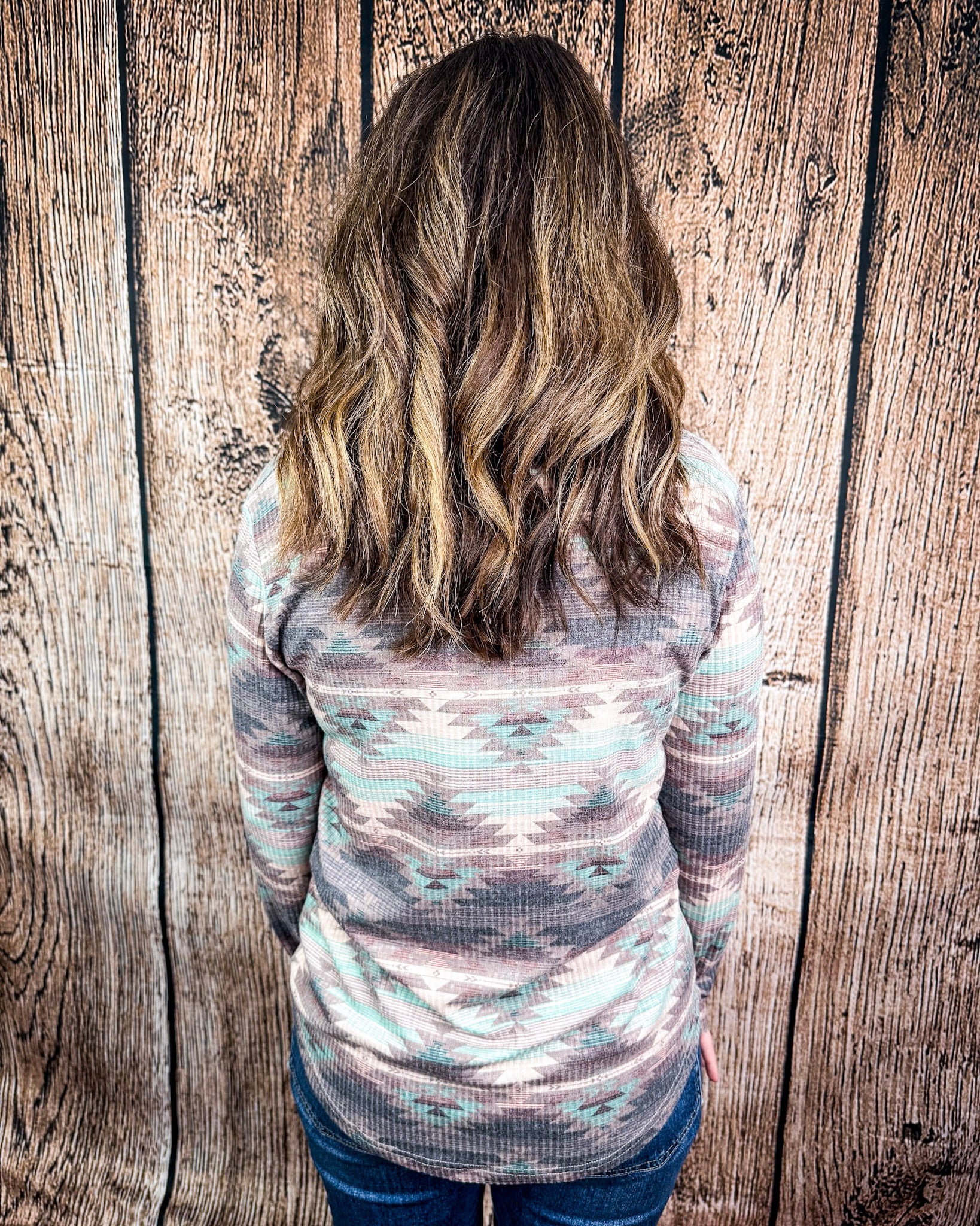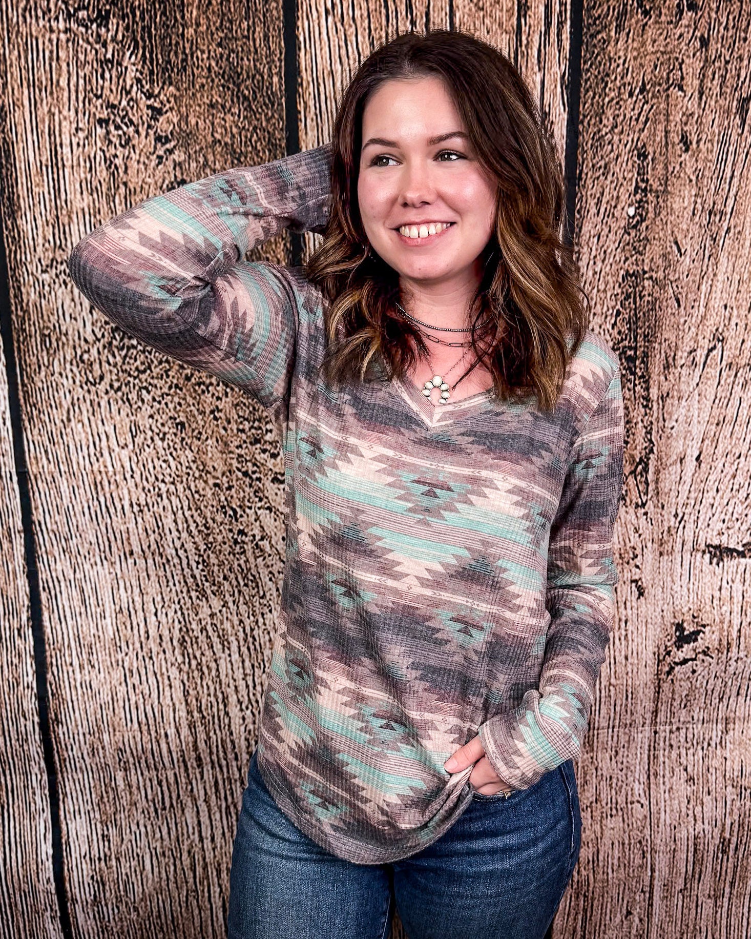 Add a little western funk to your everyday style with the Burned Out Long Sleeve Aztec Top by Sterling Kreek. Made with a soft, faded waffle knit material, this top brings together comfort and personality in one easy-to-wear piece. With its turquoise, brown, and cream aztec print, it’s the perfect way to make a statement while still keeping things casual and laid-back.