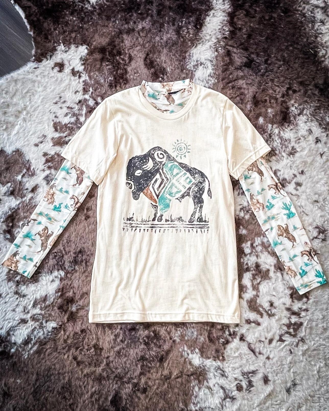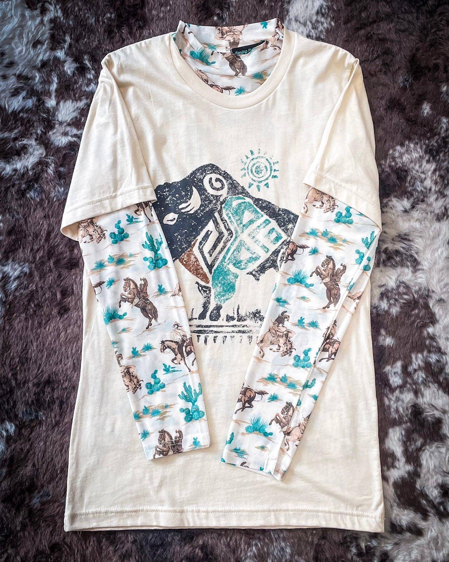 This top features a gorgeous blend of soft turquoise, golden yellows, and sunset rust tones, creating a graphic that’s pure southwest soul. From the cactus silhouette to the cowboy on horseback, it captures everything we love about wide open spaces and that golden hour glow. It’s semi-sheer, so it works beautifully over a bralette for a bolder look or layered under your favorite graphic tee or denim vest for a more laid-back vibe.