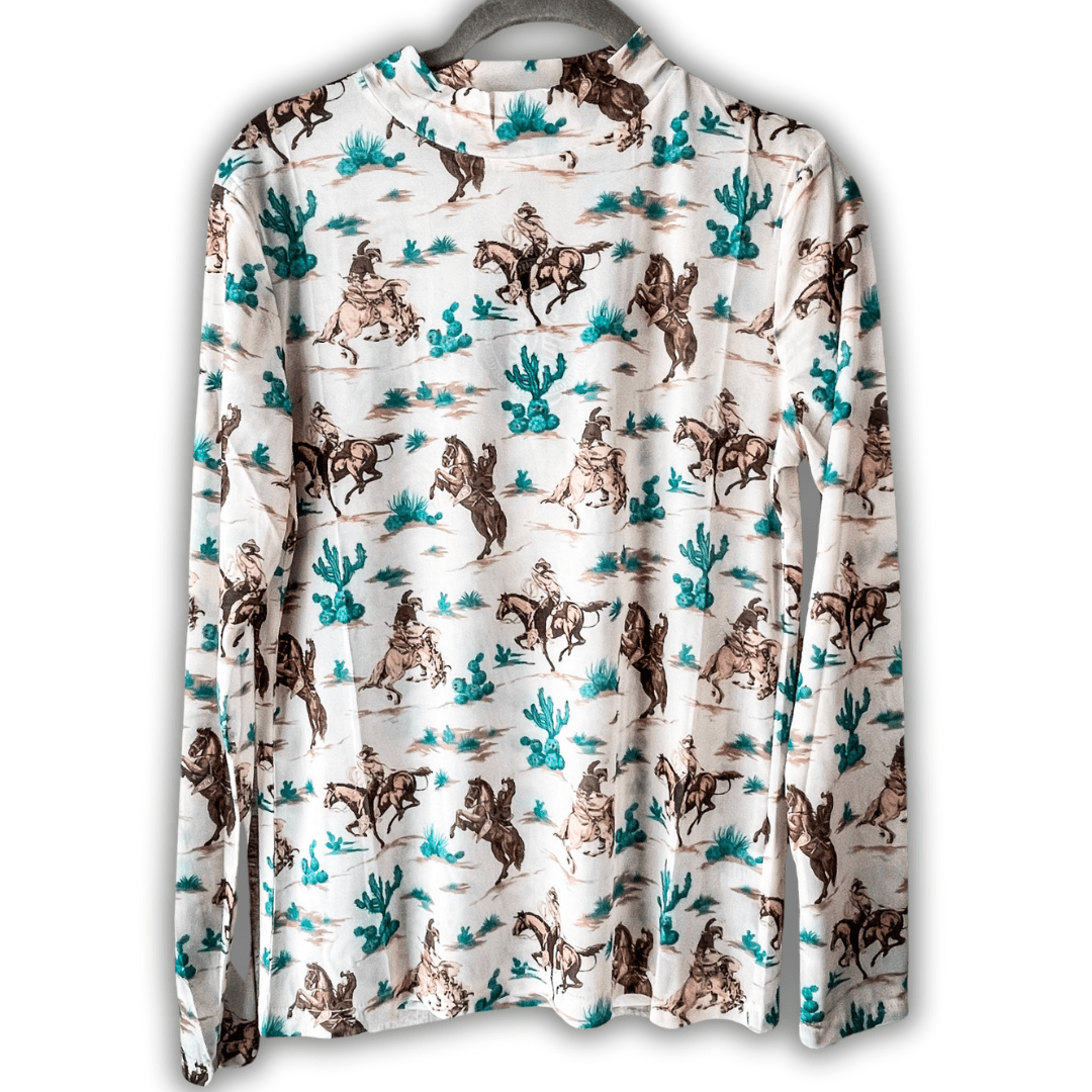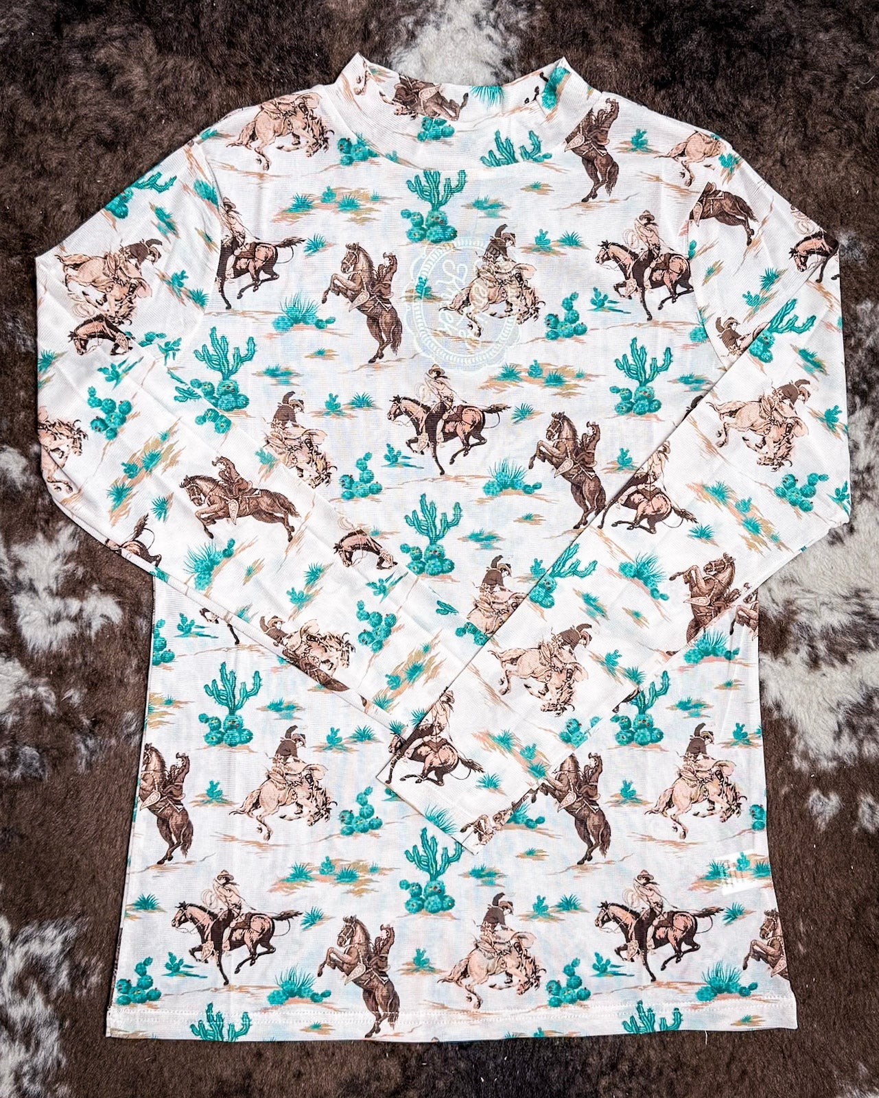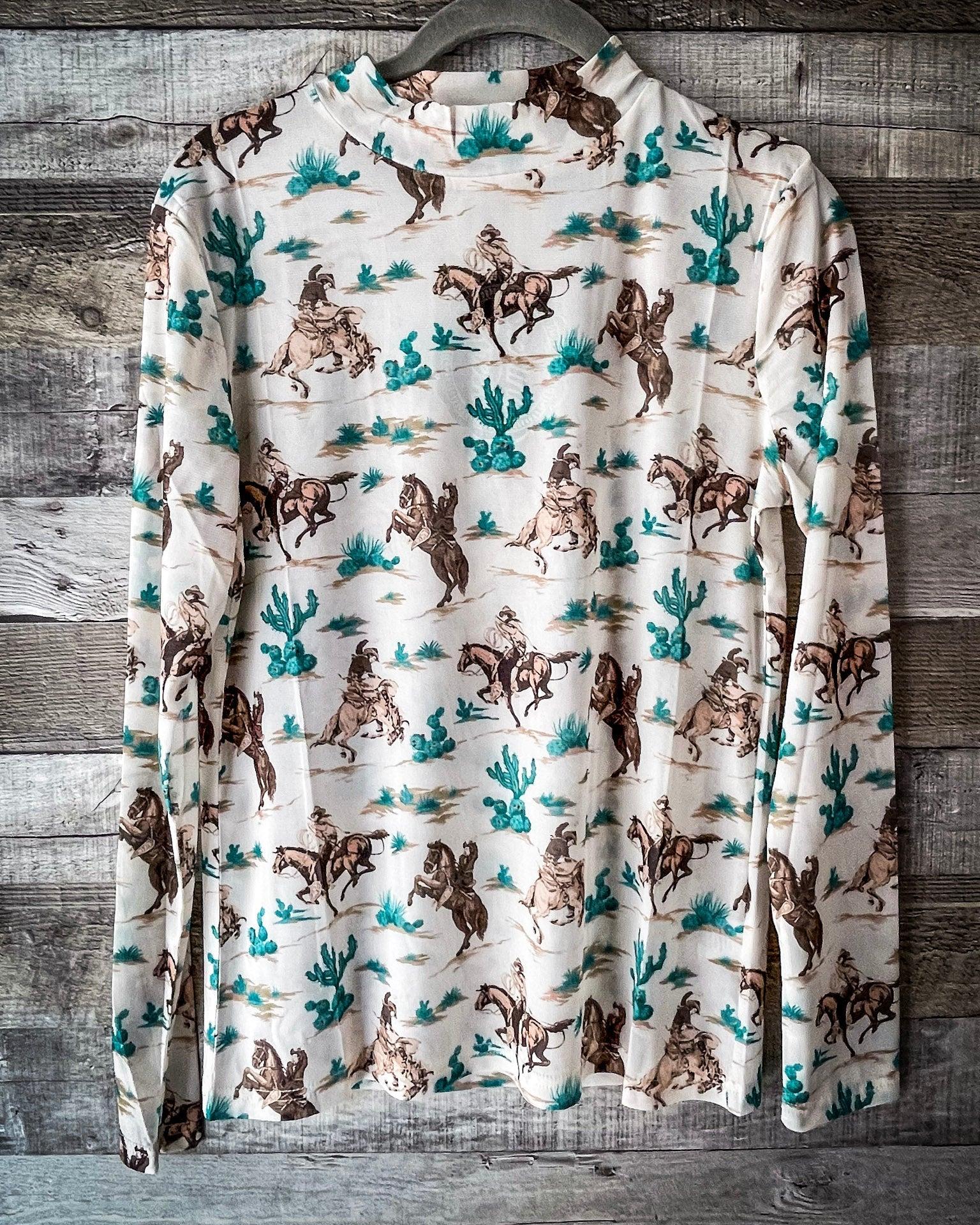 Looking for a piece that feels bold, breathable, and just the right amount of western? The Chisholm Trail Mesh Top is it. This long sleeve mesh top brings together ranch roots and city edge with a statement-making desert scene printed across a lightweight, stretchy mesh fabric. It's one of those pieces that turns heads without even trying—layered or on its own.