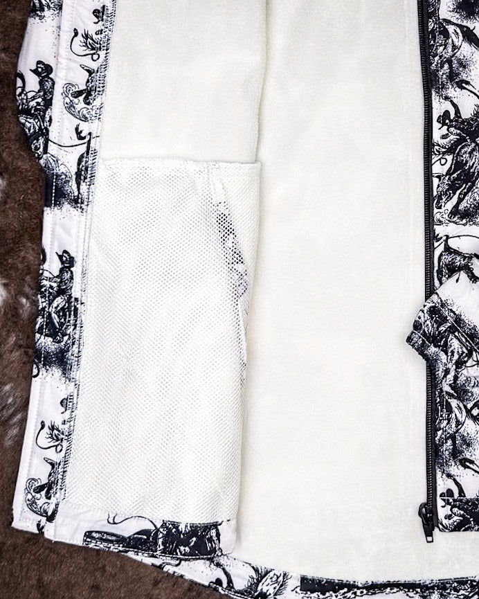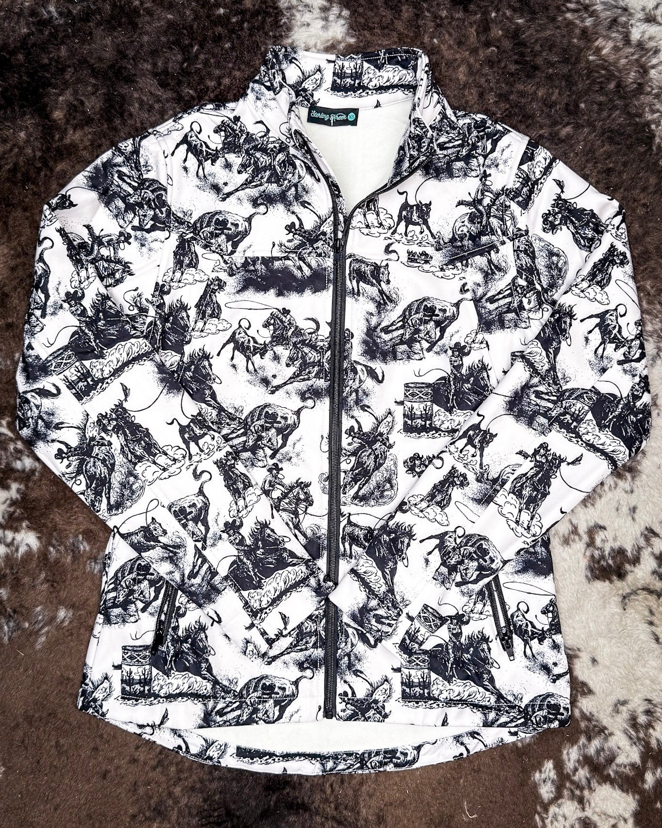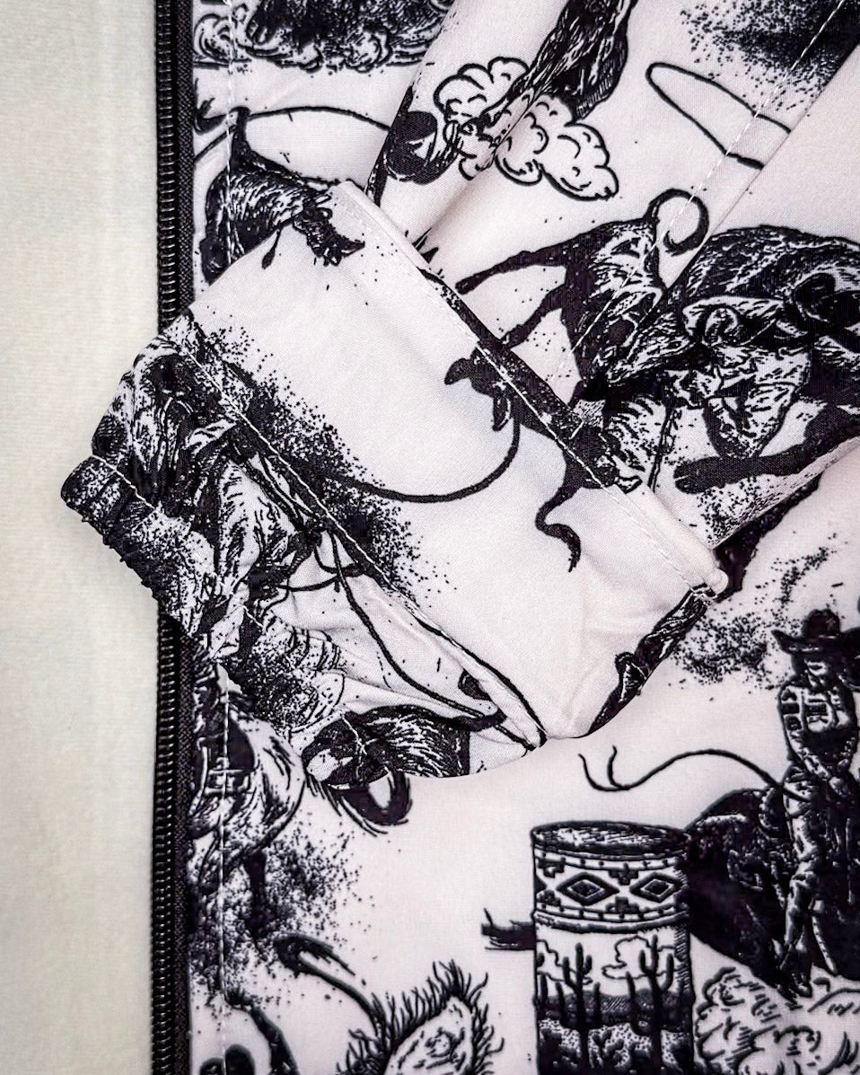 What truly sets this piece apart is its one-of-a-kind western print. Sketched in classic black-and-white ink style, the artwork features all the energy and drama of the rodeo, bucking broncs, daring riders, and hard-working cowboys. Every time you wear it, you carry a little piece of the arena with you.