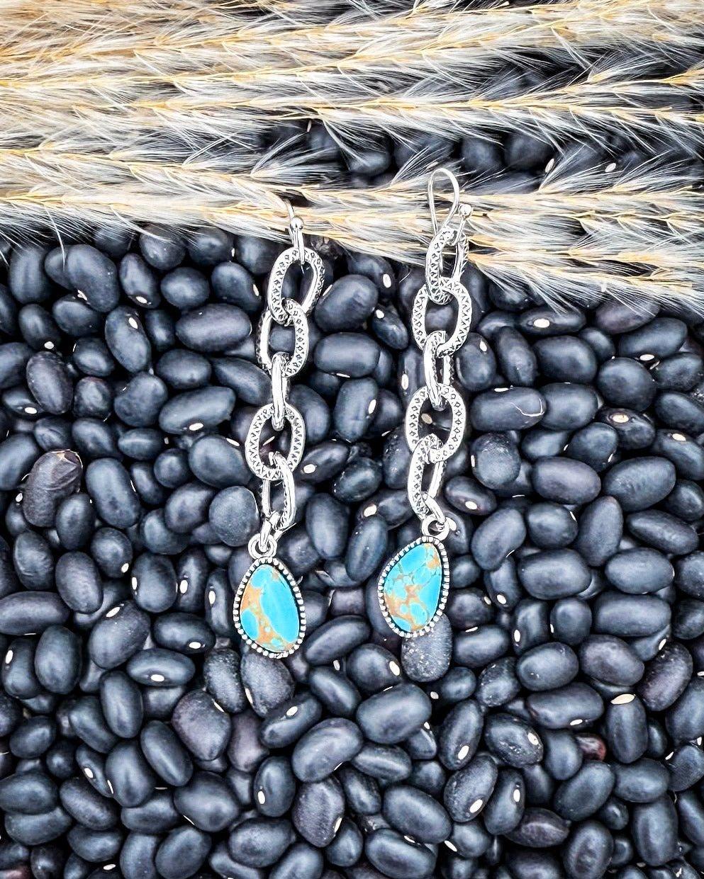 Chic, bold, and full of effortless movement — the Linked In Chain Dangle Earrings are made to stand out. Designed with a series of textured silver links that catch the light beautifully, each earring finishes with a teardrop turquoise-style accent for that perfect pop of color.
