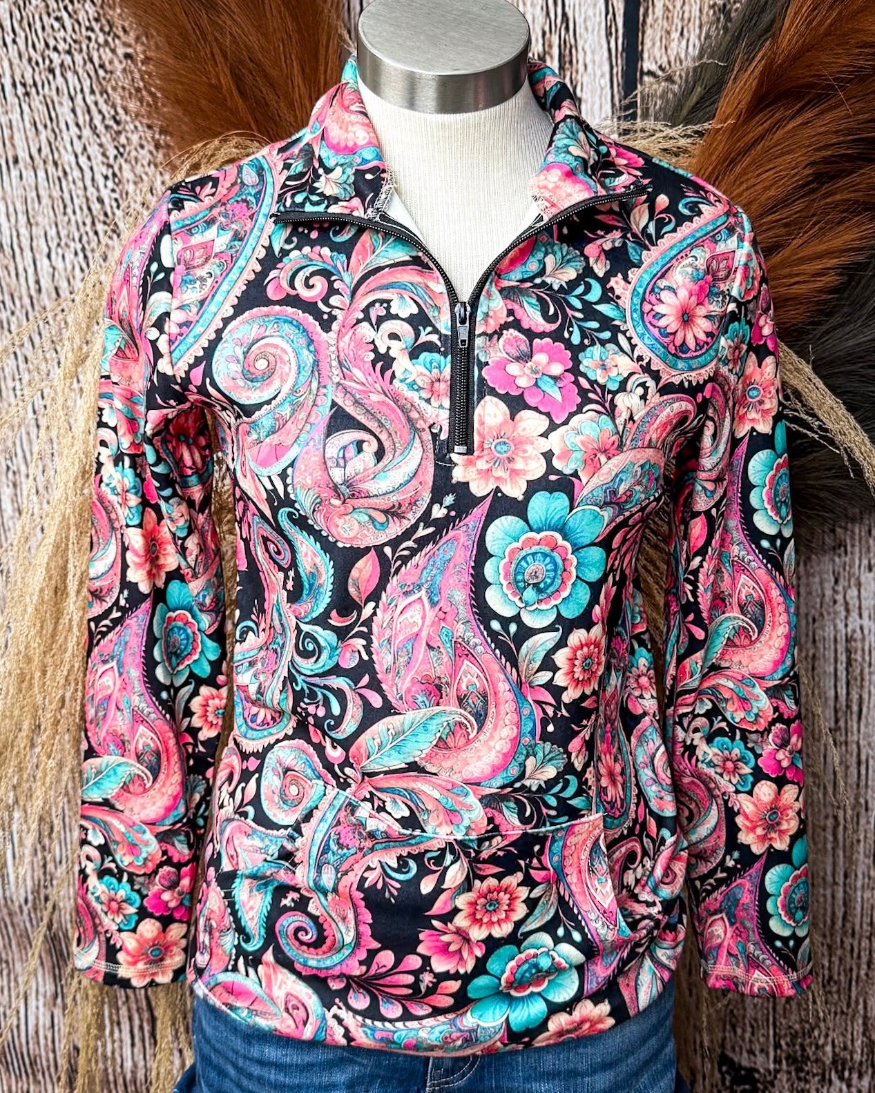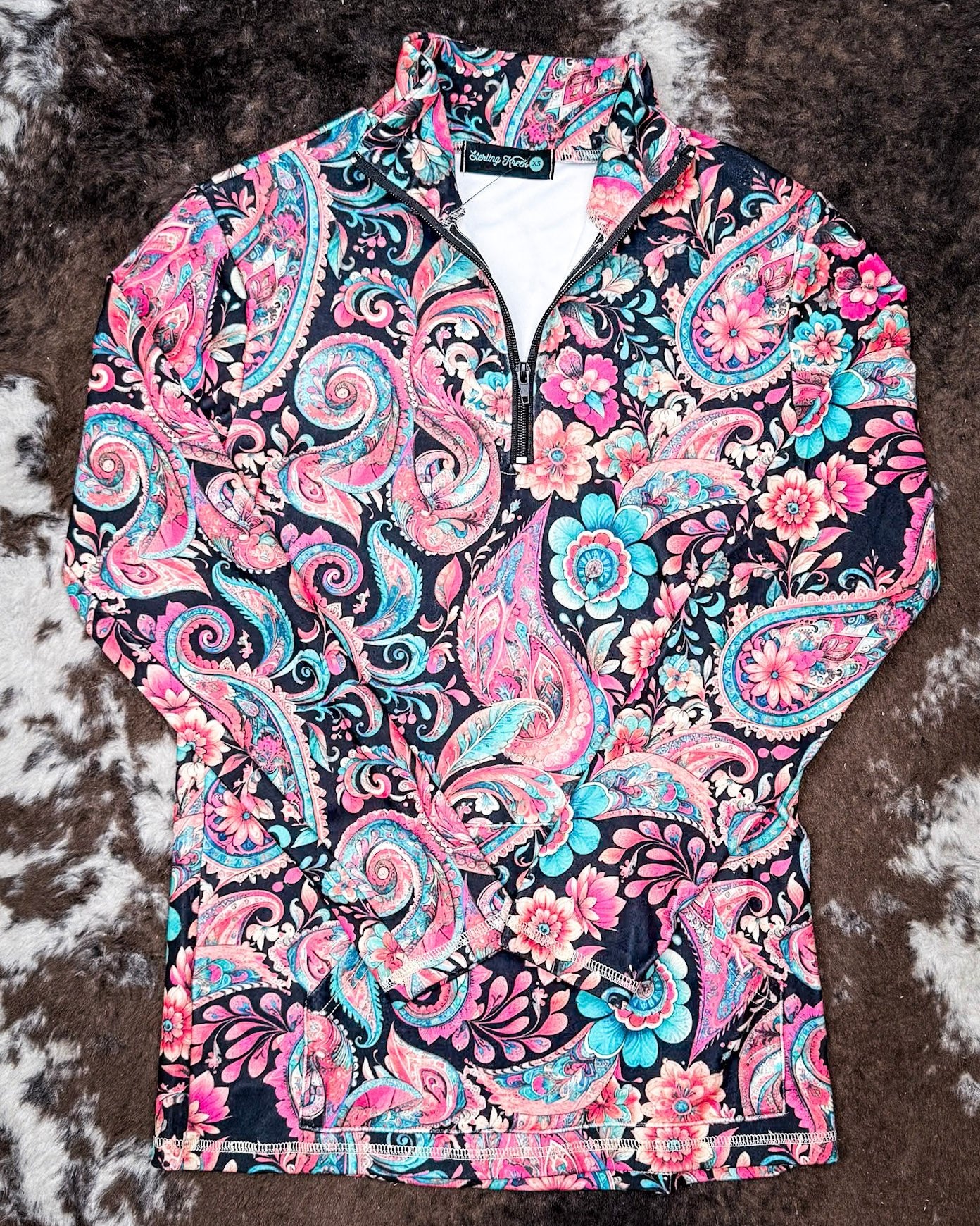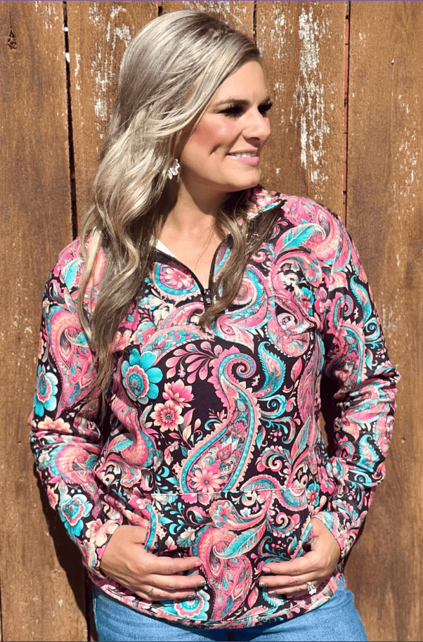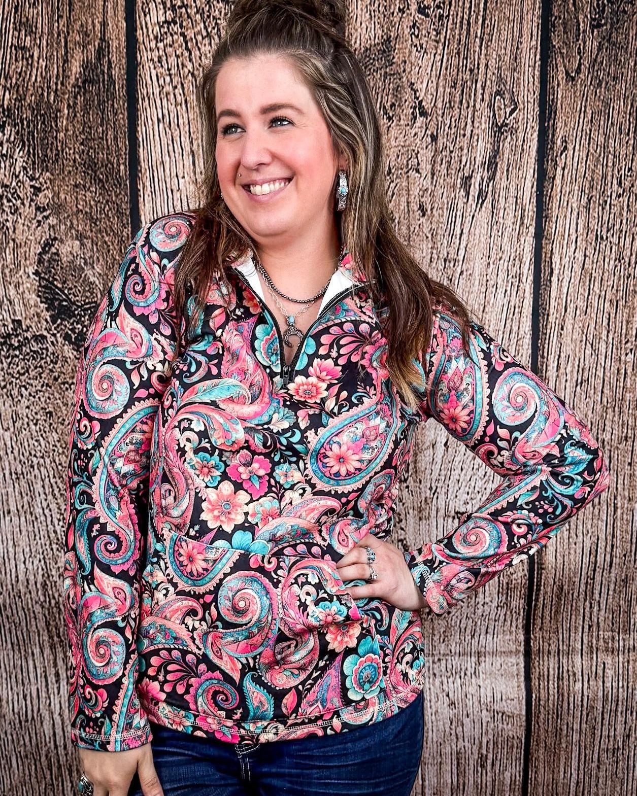 Let’s talk details. The Midnight Bloom Fitted Pullover features a vibrant paisley and floral pattern with shades of turquoise, coral, hot pink, and soft cream dancing over a deep black background. The colors are rich and lively, but not over-the-top—just enough to turn heads in the best way. Whether you’re heading out for the day or layering up for a chilly evening, this pullover brings just the right balance of western charm and modern style.