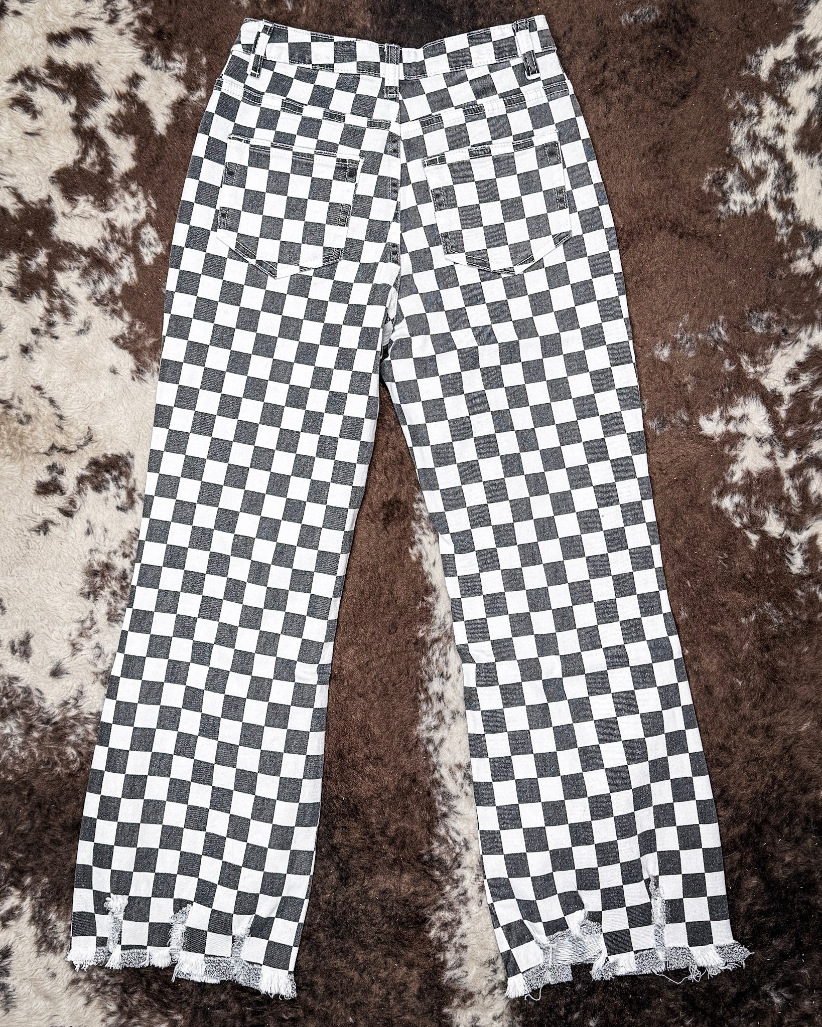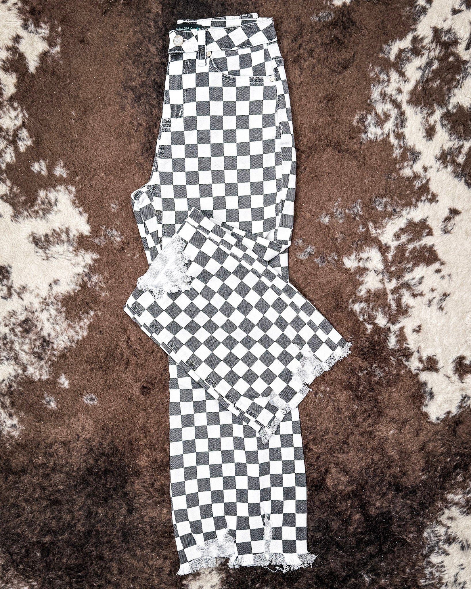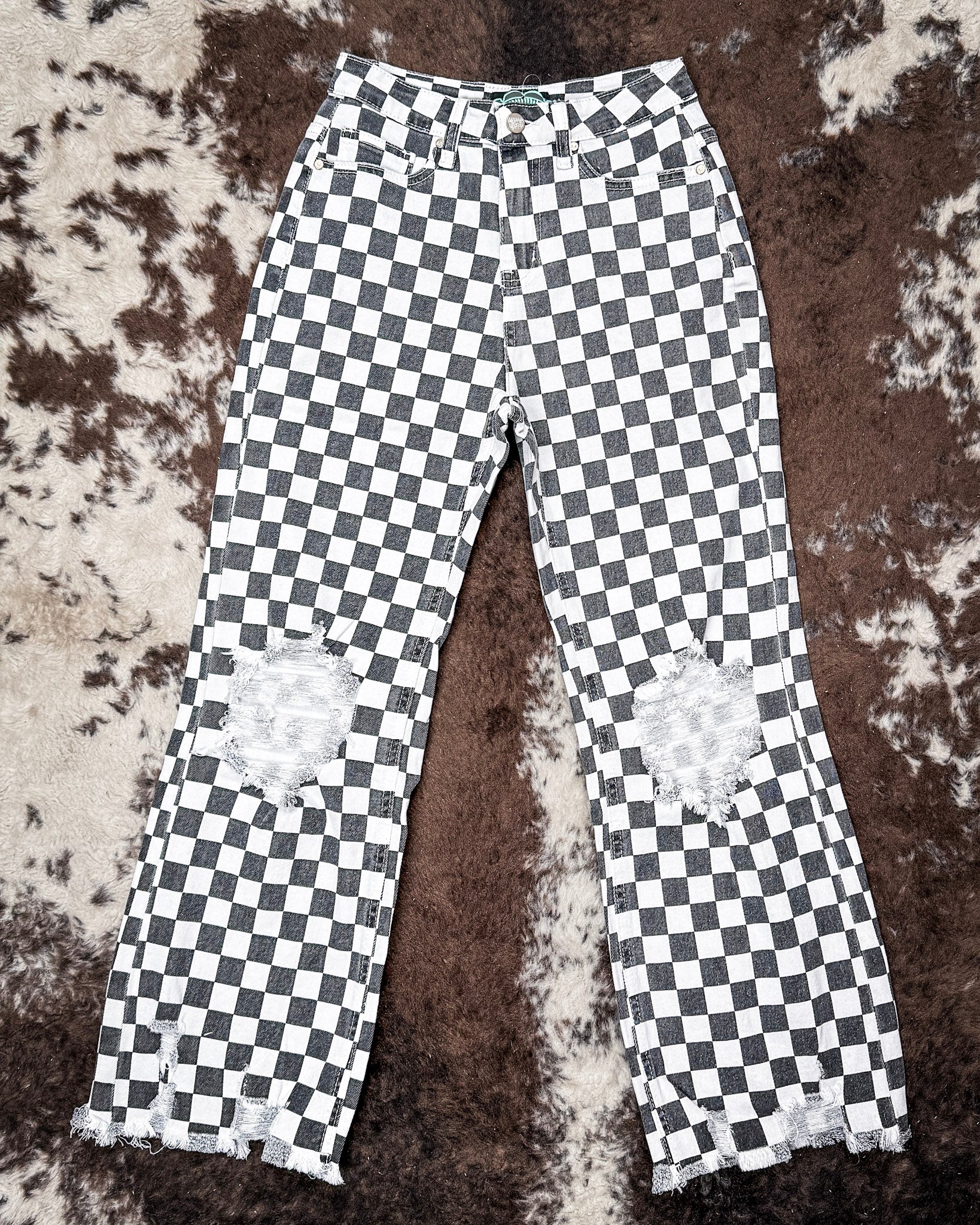 • The Round The Track Jeans are made for standing out without trying too hard. Featuring a bold black and white checkered pattern with a slightly faded finish, these jeans bring vintage race day energy with a modern western edge. Distressed knee details add just the right amount of attitude, giving them that worn-in, lived-in feel.