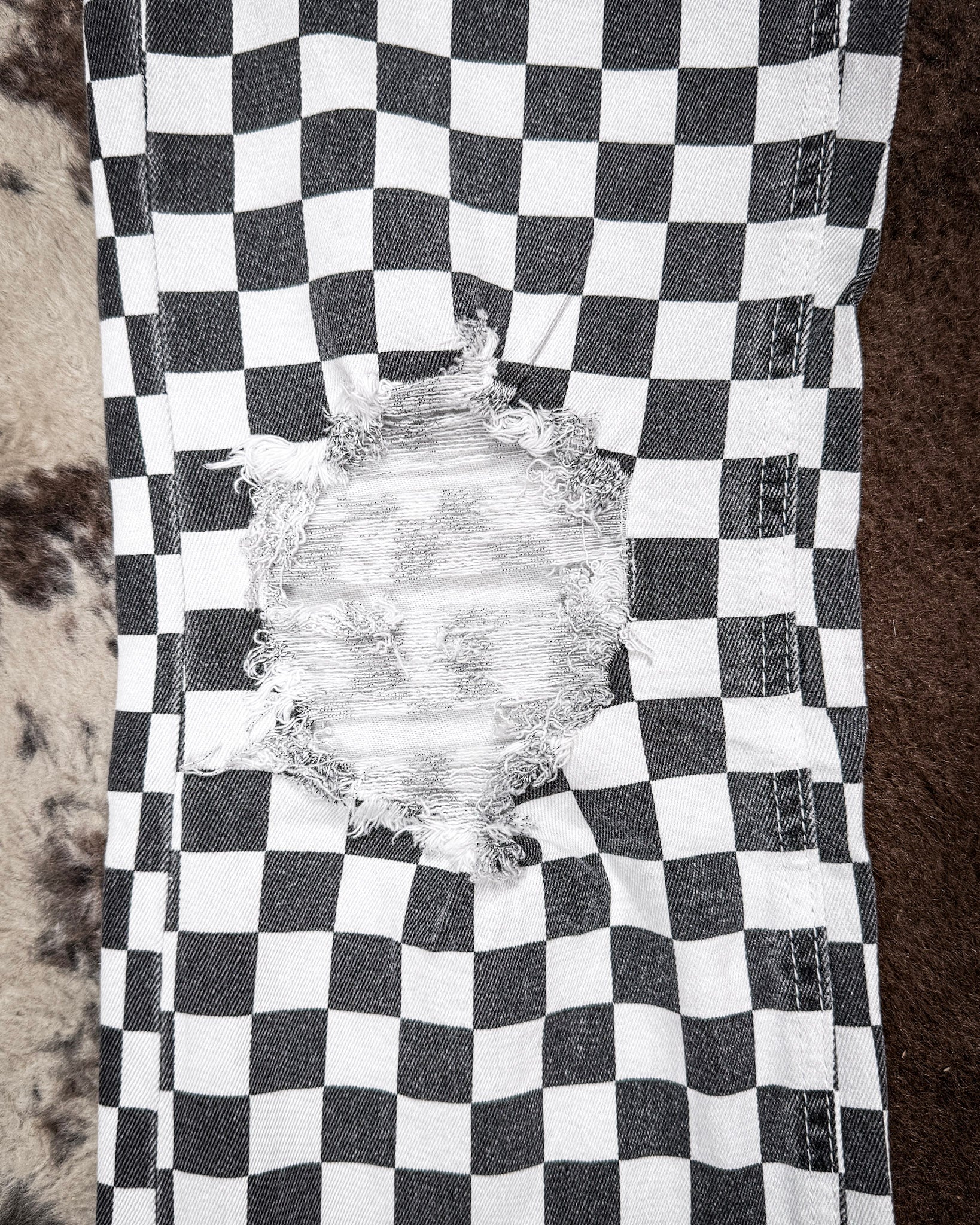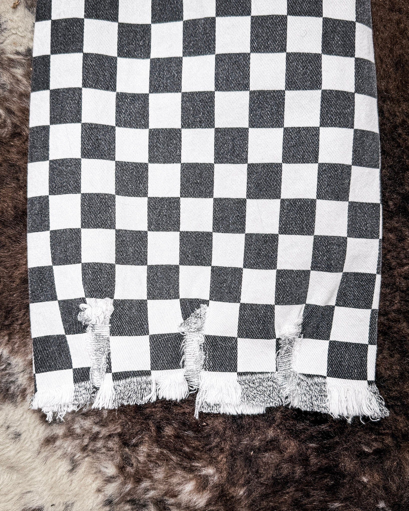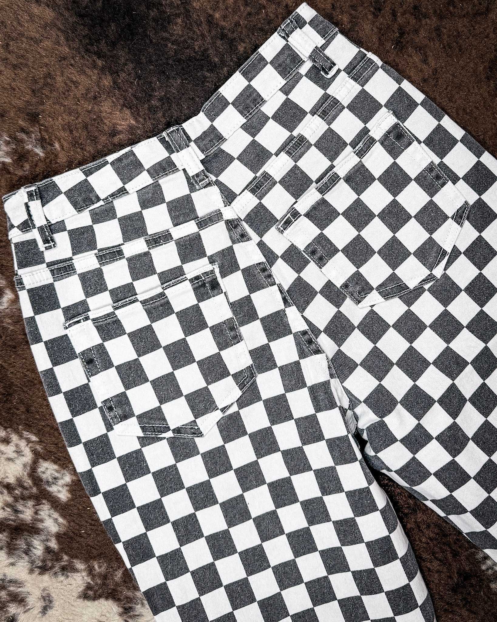• The Round The Track Jeans are made for standing out without trying too hard. Featuring a bold black and white checkered pattern with a slightly faded finish, these jeans bring vintage race day energy with a modern western edge. Distressed knee details add just the right amount of attitude, giving them that worn-in, lived-in feel.