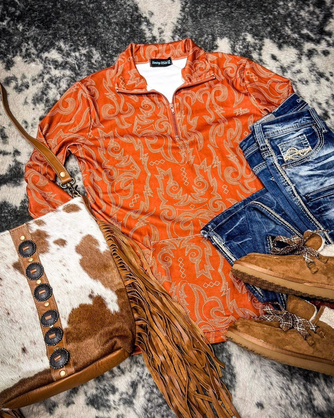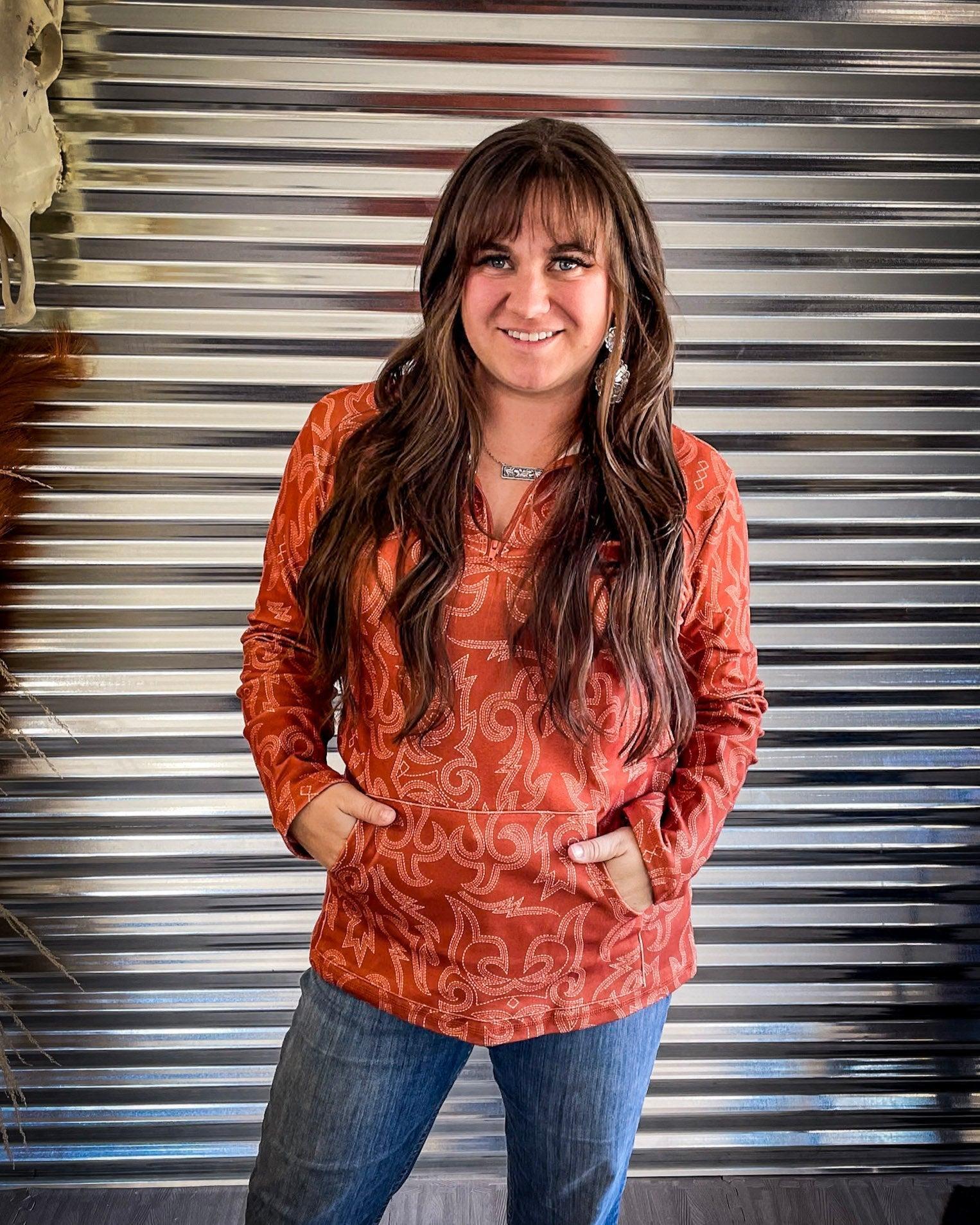 What really sets this piece apart is the bold, rich rust color. It’s warm, earthy, and full of life—like a sunset over the prairie. This isn’t just another neutral layer to throw on and forget. It’s the kind of color that turns heads, lifts moods, and stands out in a crowd. Pair it with denim and boots for a casual western look, or toss it over leggings when you're leaning into comfy vibes.