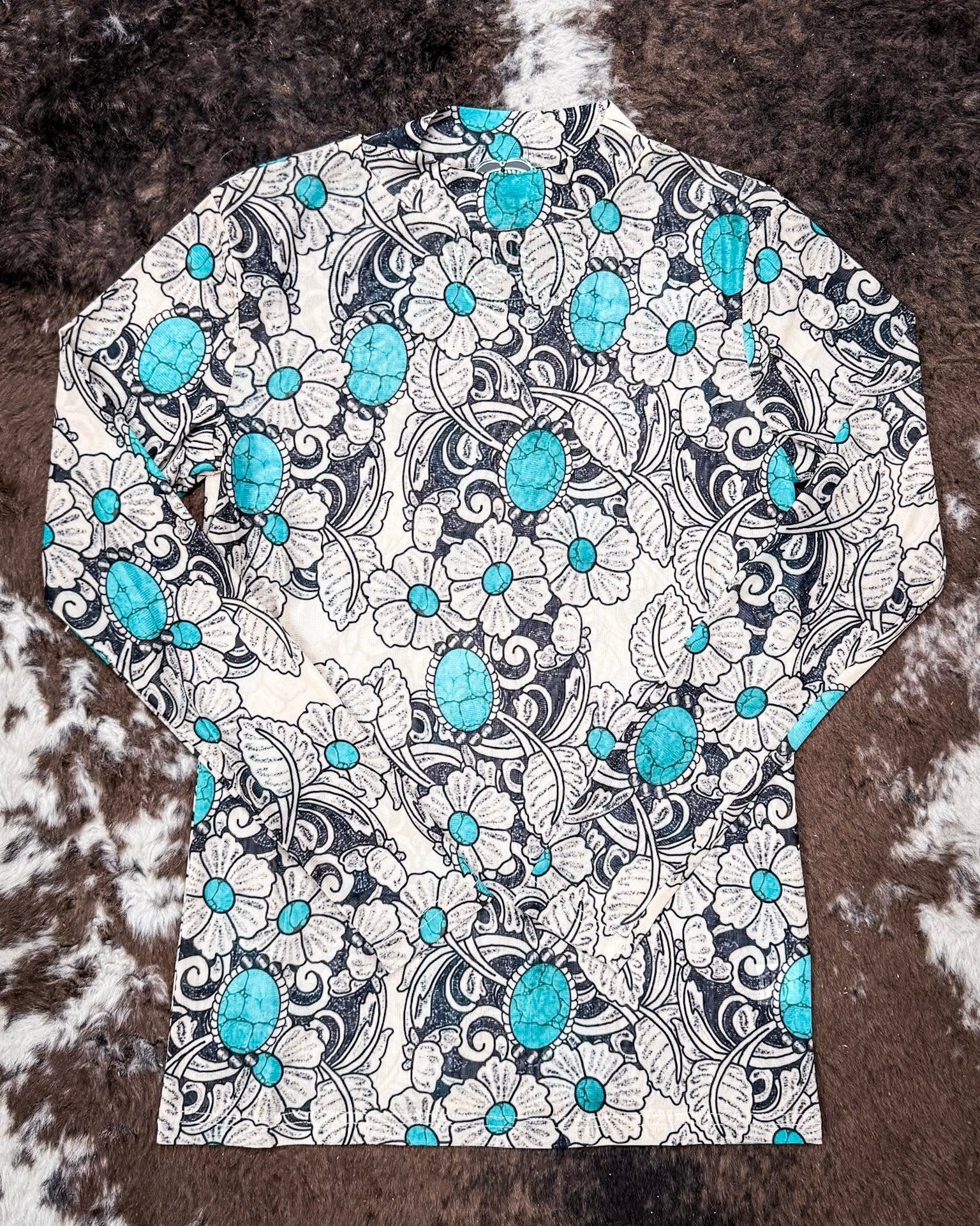 The allover print gives serious personality, combining crackled turquoise tones with detailed black outlines that create a layered, textured look. It’s the kind of pattern that makes people stop and ask, “Where’d you get that?”