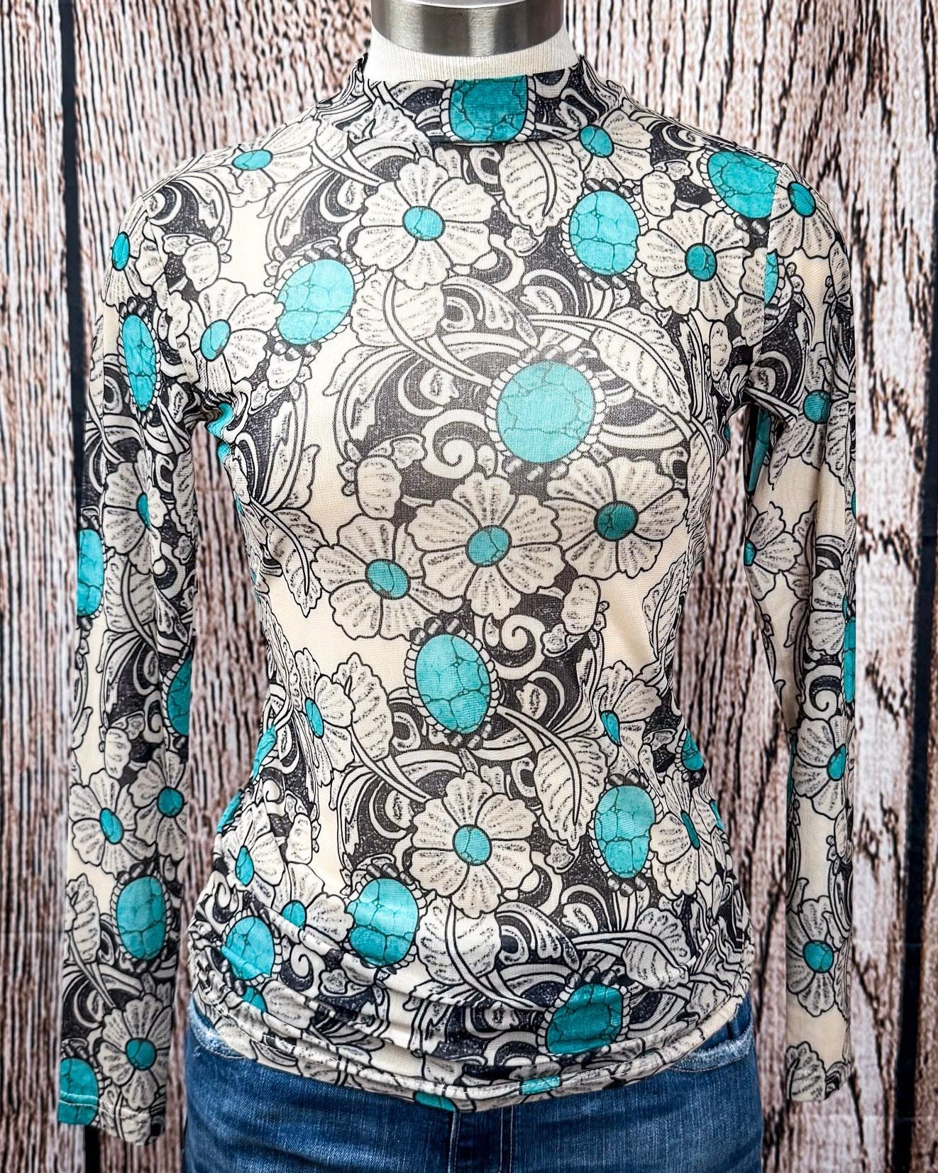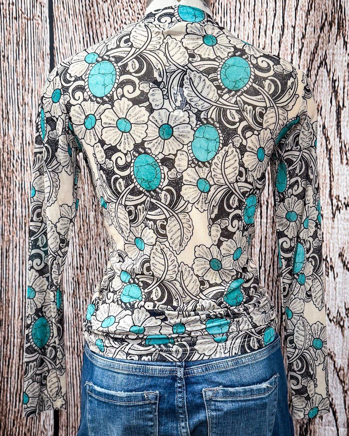 Make a statement without saying a word in the Tattoos on This Town Mesh Top—a bold, head-turning piece that blends western roots with tattoo-inspired artistry. Designed to stand out, this top features a sheer mesh base printed with turquoise floral blooms and tooled-style swirls that mimic the look of vintage ink and leatherwork.