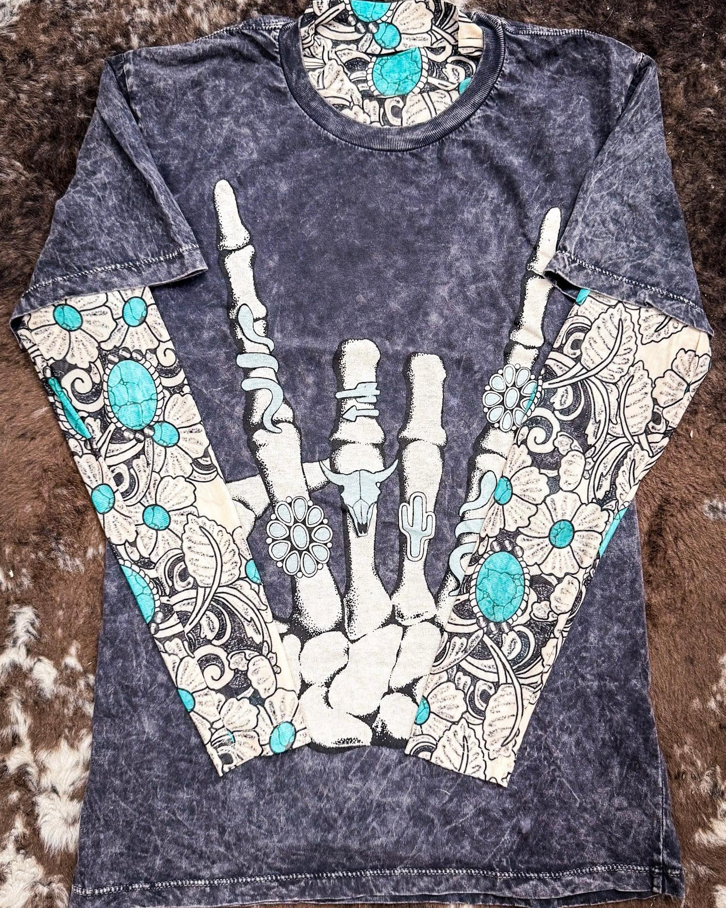 The high neckline and long sleeves offer that chic, full-coverage silhouette while still letting the print do all the talking. Whether you wear it tucked into your jeans, layered under a graphic tee, or paired with a leather mini and boots, Tattoos on This Town brings big western energy in a modern, wearable way.