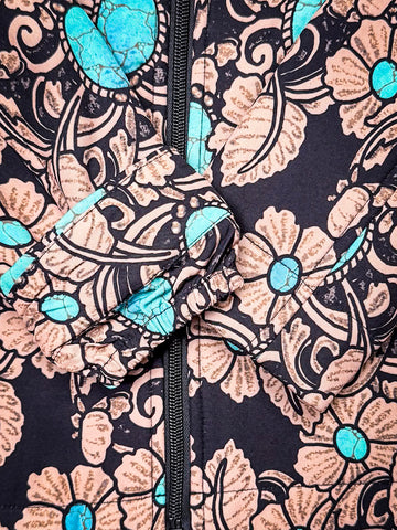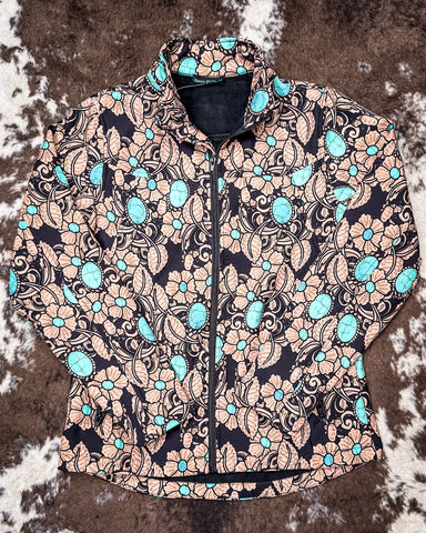 Turn heads and take on the day in the Tattoos On This Town Soft Shell Jacket by Sterling Kreek. With its bold tattoo-inspired tooled print and striking turquoise accents, this jacket brings western edge and fearless style to your outerwear collection. Designed with both fashion and function in mind, it’s built to stand out and keep you comfortable when you’re out in the elements.