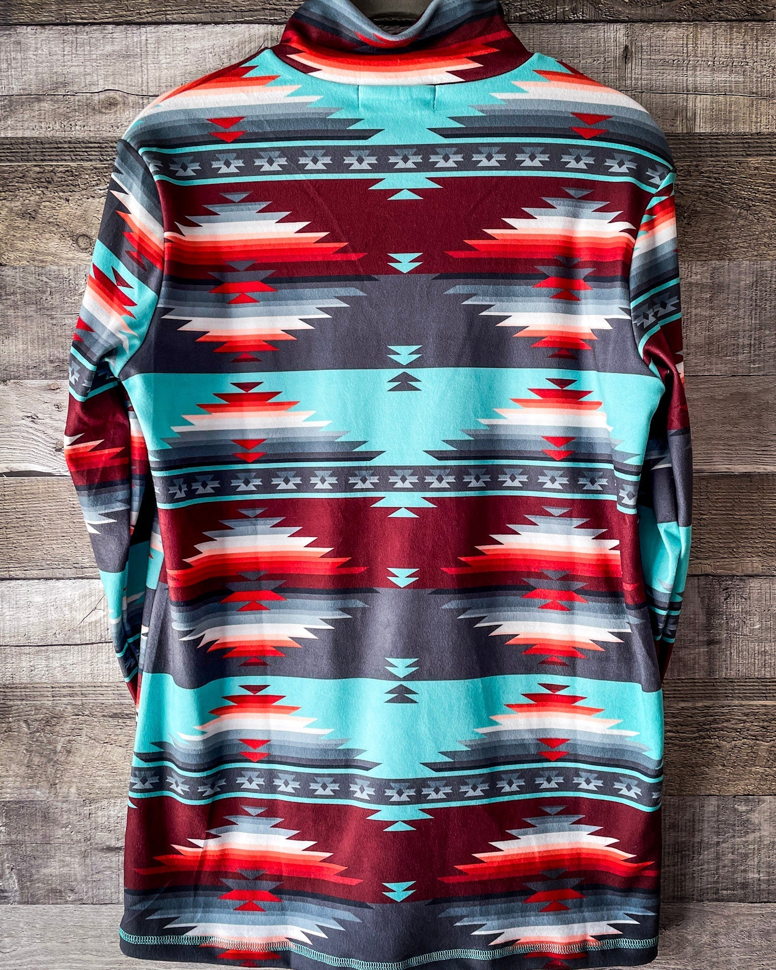 The Aztec-inspired print packs a punch with deep reds, cool turquoise, charcoal, and white. All perfectly balanced for a vibrant but wearable look. It’s bold without being busy, eye-catching without trying too hard. Whether you're styling it up for the day or throwing it on after sundown, this pullover always shows up right.