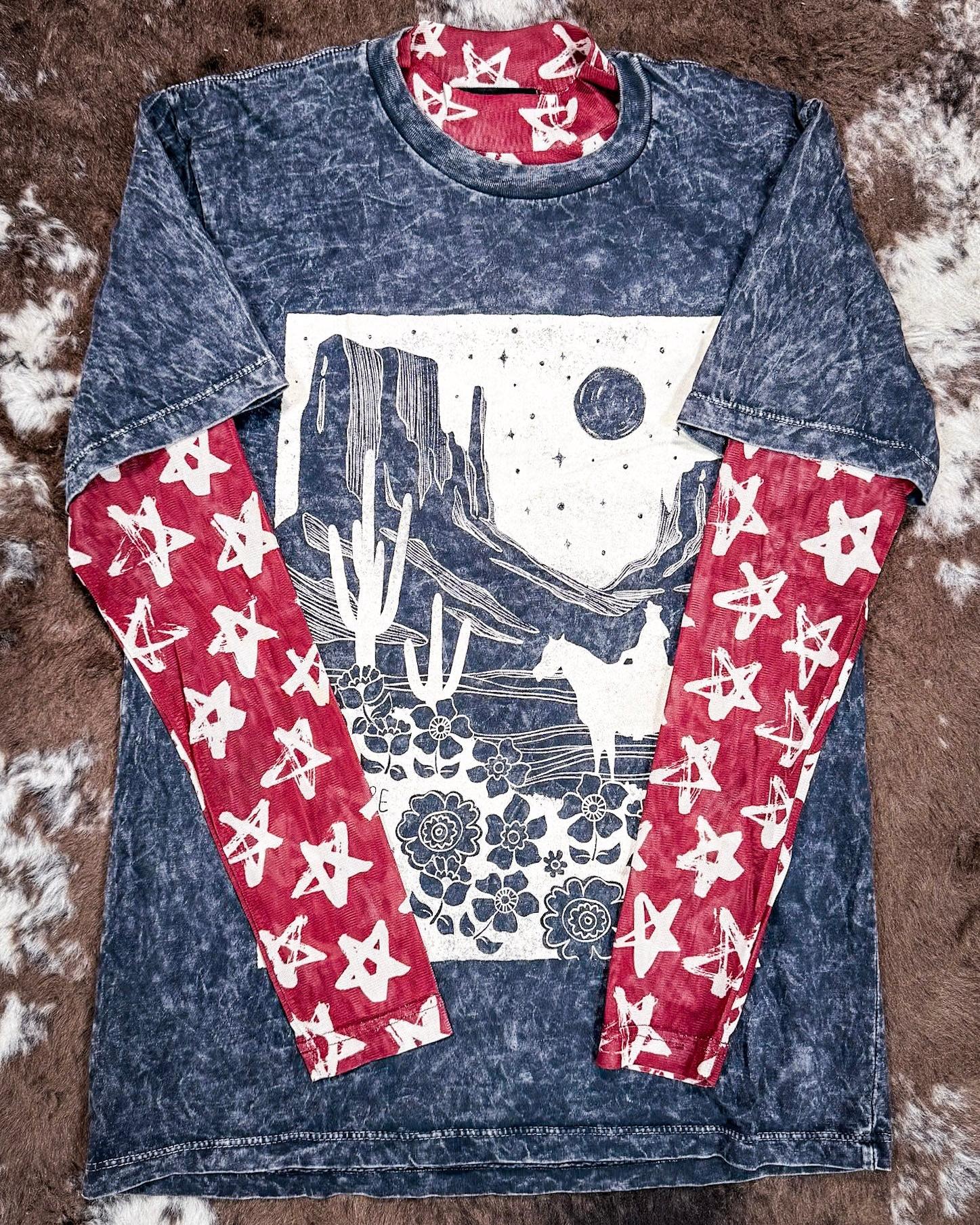 Designed for versatility, this top seamlessly transitions from casual outings to statement evening looks. Pair it with high-waisted jeans and cowboy boots for a classic western vibe, or style it with a leather skirt and bold accessories for a more fashion-forward, edgy appeal. The long sleeves provide added coverage while maintaining a breathable feel, making it an excellent choice for layering during transitional seasons. Whether you’re at a concert, a rodeo, or a night out with friends, the Stars At Night Red Top ensures that you stand out while staying effortlessly stylish.