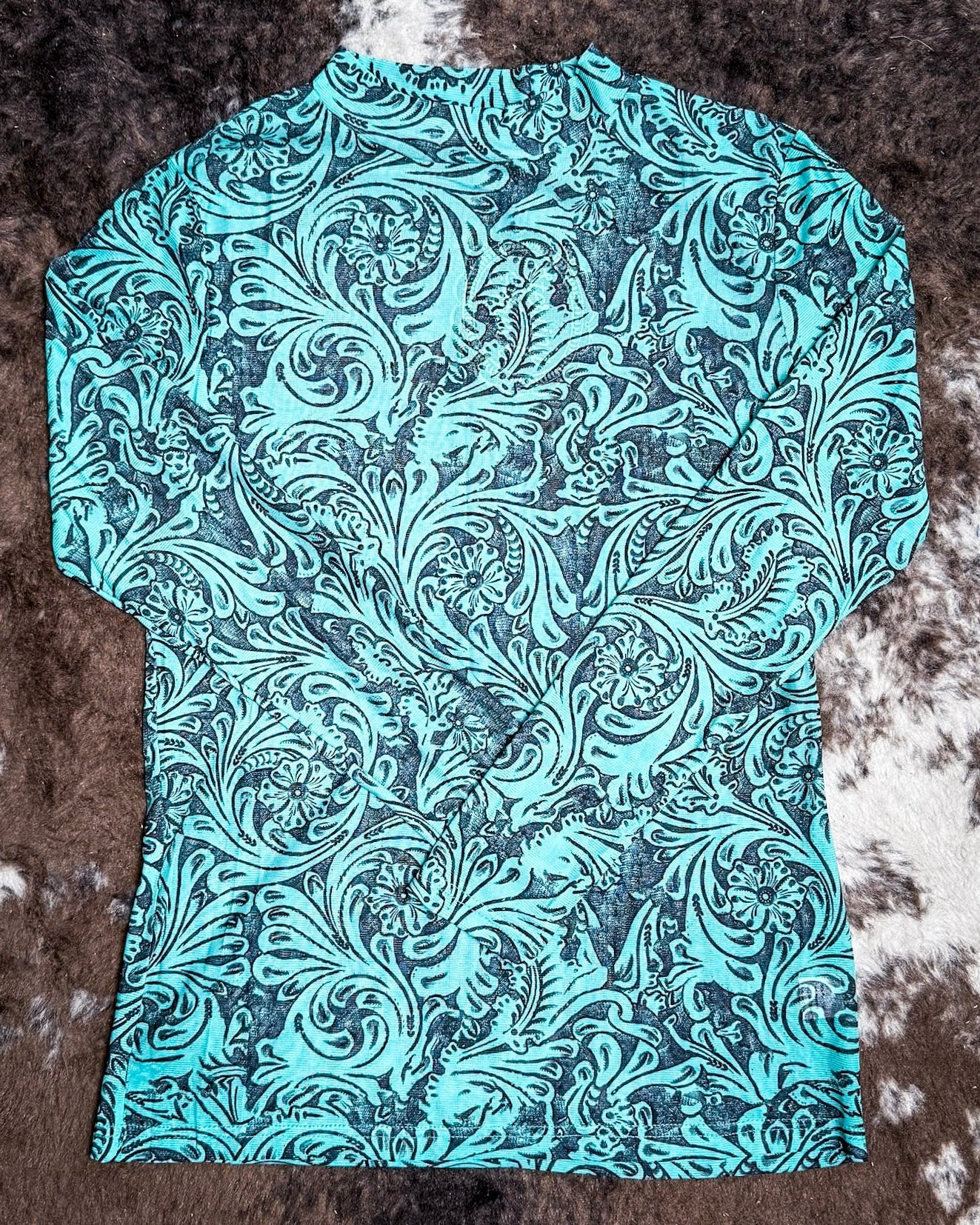This Tooled In Turquoise Top is for all the wild ones out there! With its turquoise tooled print mesh fabric and long sleeves, you'll add some serious style to any occasion. Get ready to shine!