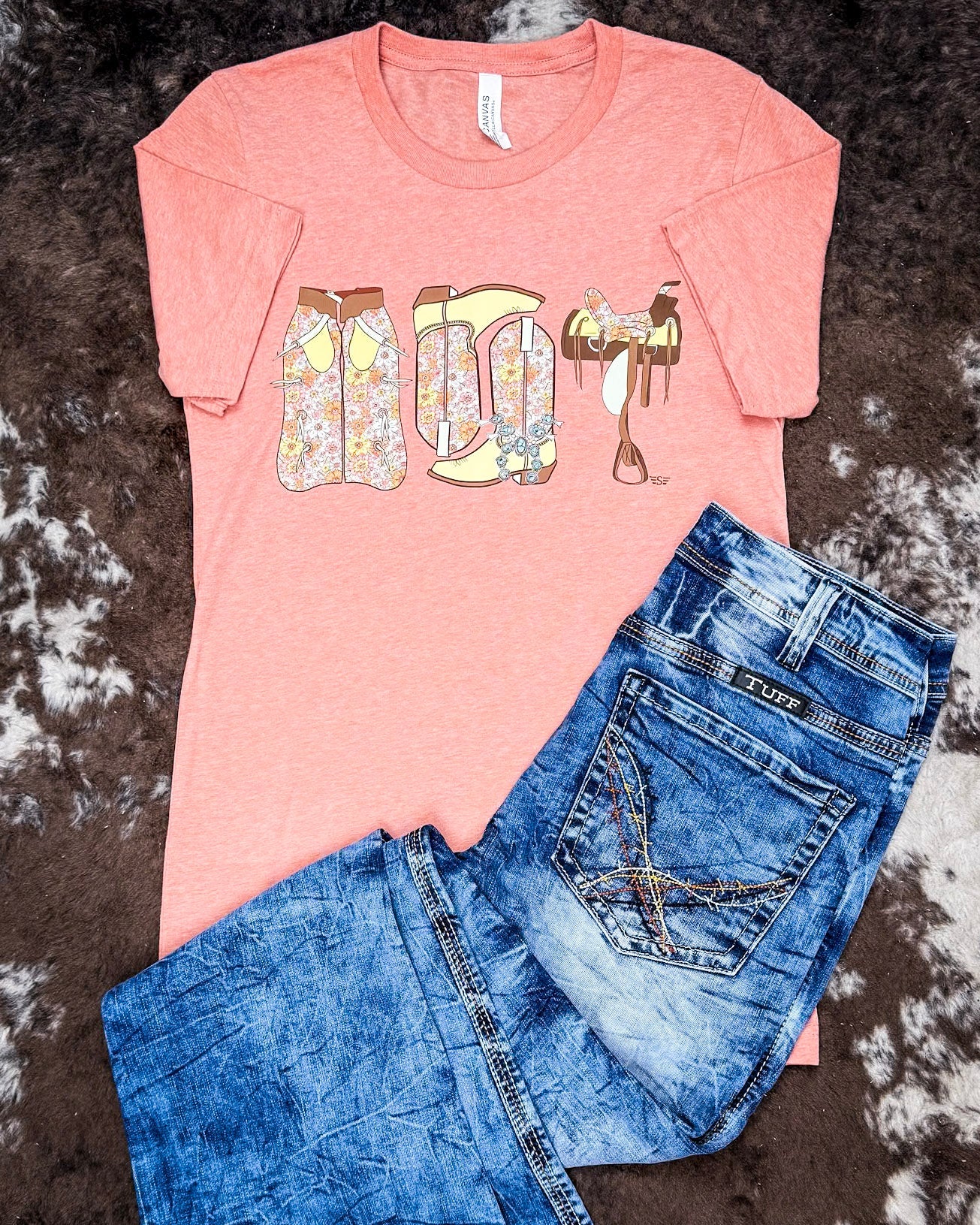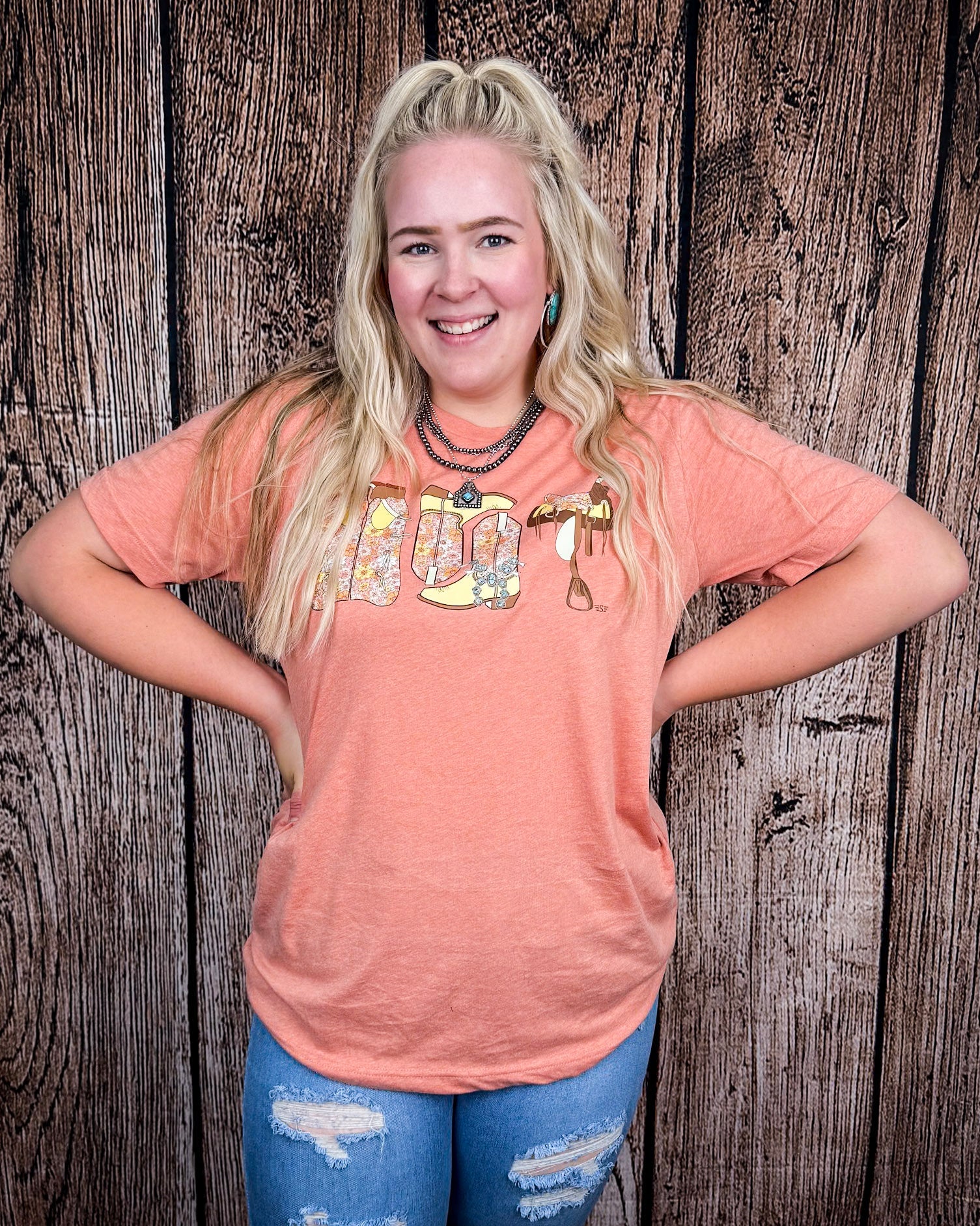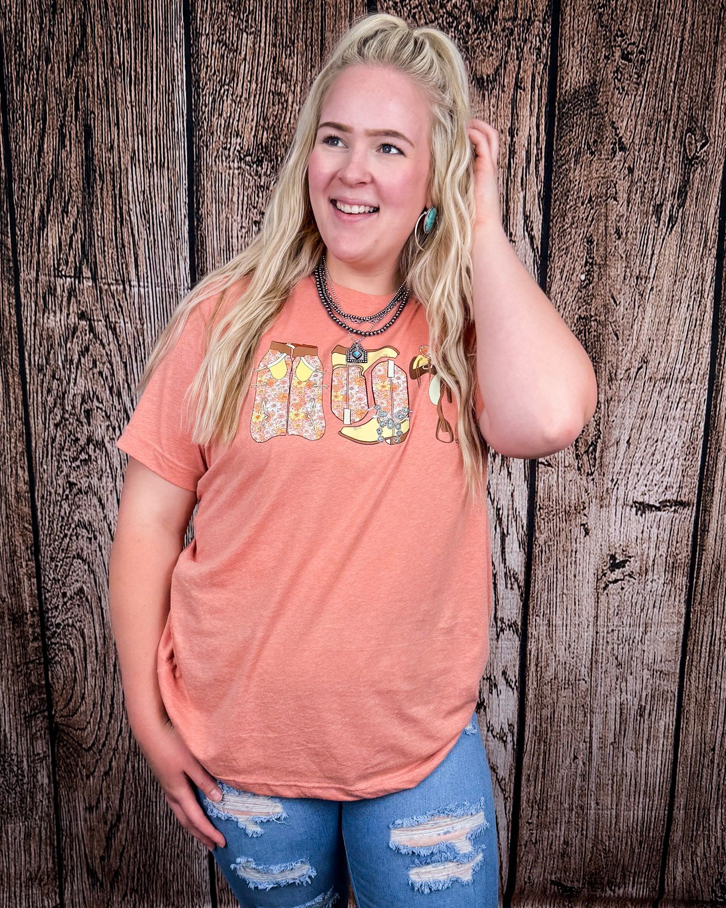 The graphic uses classic western essentials: boots, a hat, and a saddle, all decked out in a blooming, boho-inspired floral print. Each illustrated piece is full of vintage charm and soft pastel detail, giving this tee a fresh yet nostalgic feel. It’s playful, artistic, and full of personality—just like the women who wear it.