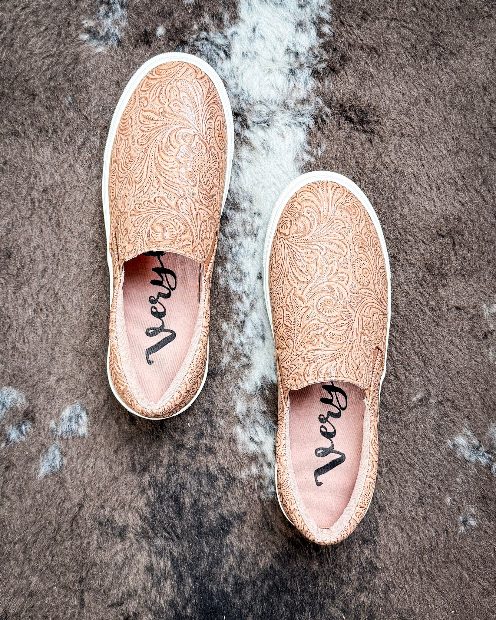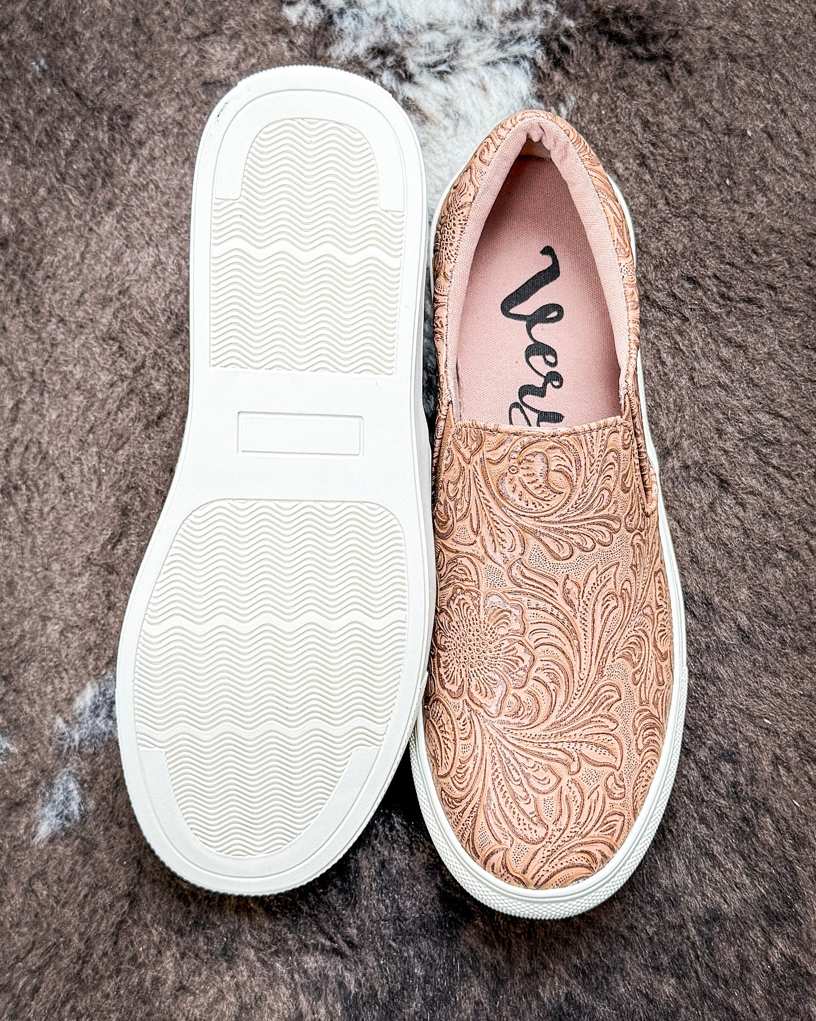 The Nova Slip-On Sneaker in Tan by Very G blends rich texture with everyday comfort for an effortless, on-the-go look. Designed with an embossed faux leather upper, this sneaker features intricate floral tooling-inspired detail that adds depth and western character without feeling overdone.
