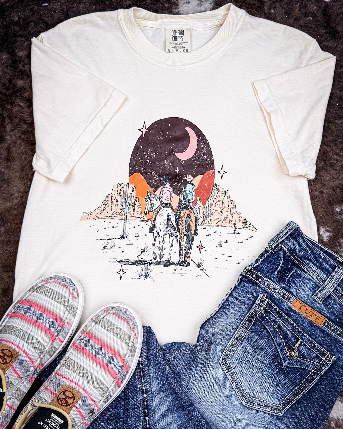 Front and center is a dreamy graphic that captures the spirit of the open west—two riders headed into the horizon, framed by dusty mountains, a crescent moon, and a sky full of stars. It’s artistic, subtle, and a little bit nostalgic—like a love letter to long drives, quiet nights, and wide open skies.