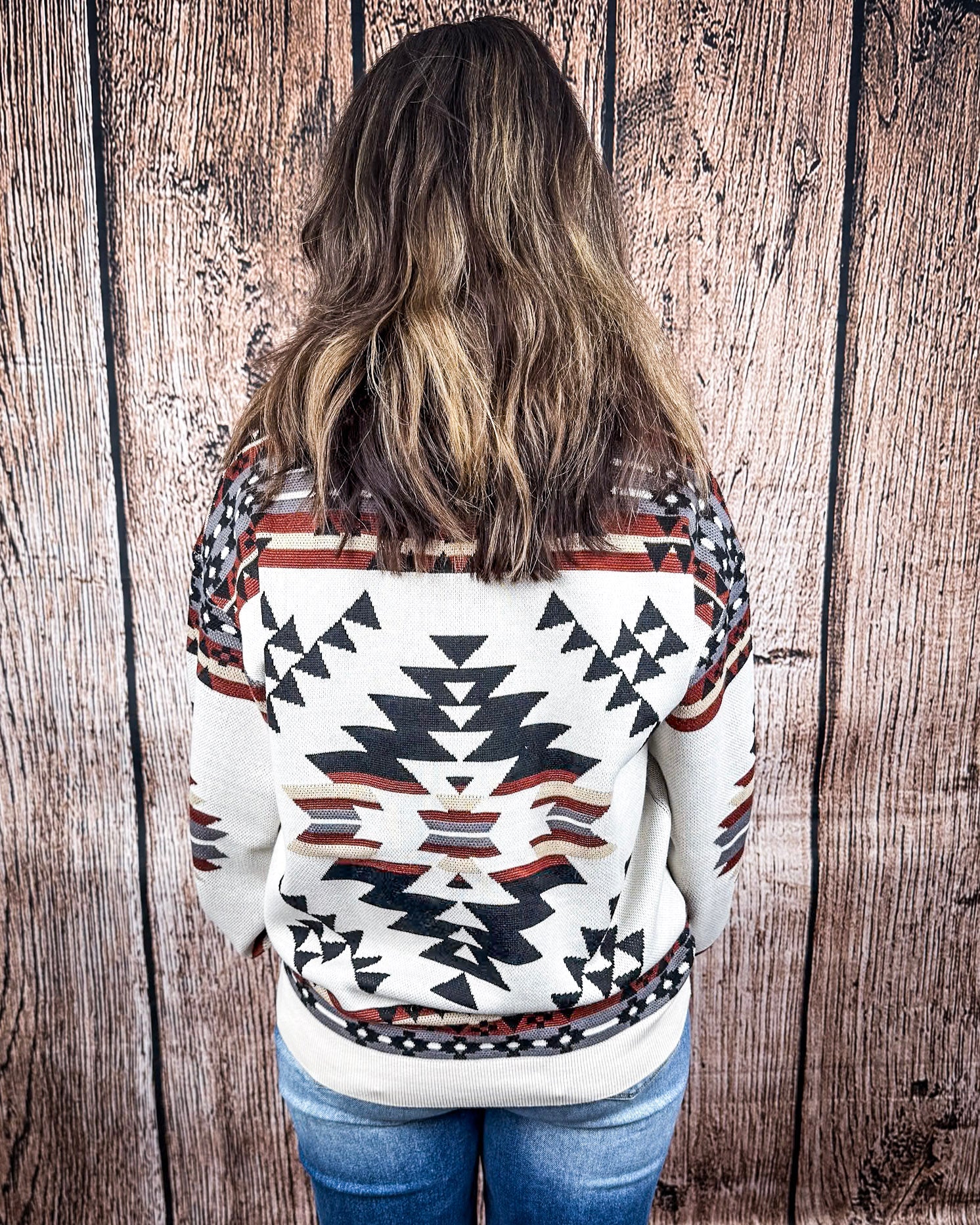 The Lean On Me Knit Sweater is made to be versatile. Pair it with dark wash denim and boots for a night at the rodeo, or throw it on with cutoffs and sneakers for a casual day look. The bold Aztec print makes it a natural match for turquoise jewelry and leather accessories. For chilly days, layer it over a chambray shirt with the collar peeking out for a touch of texture and extra warmth.