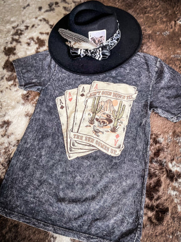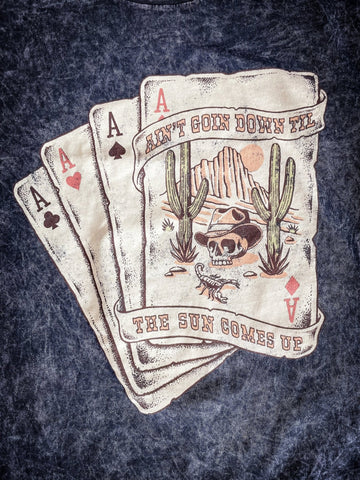Here comes the night, but that doesn't mean the fun has to stop, right Cowgirl? Our Ain't Going Down Till The Sun Comes Up Graphic Tee, just like you, is ready for all the action! With its kick-up-your-boots kind of black mineral wash, it's about as wild west as you can get without actually holding a pair of aces up your sleeve. This tee's oversized boyfriend fit is the equivalent of comfort food after a long day in the saddle. Go ahead, play your cards right and add this to your western collection!
