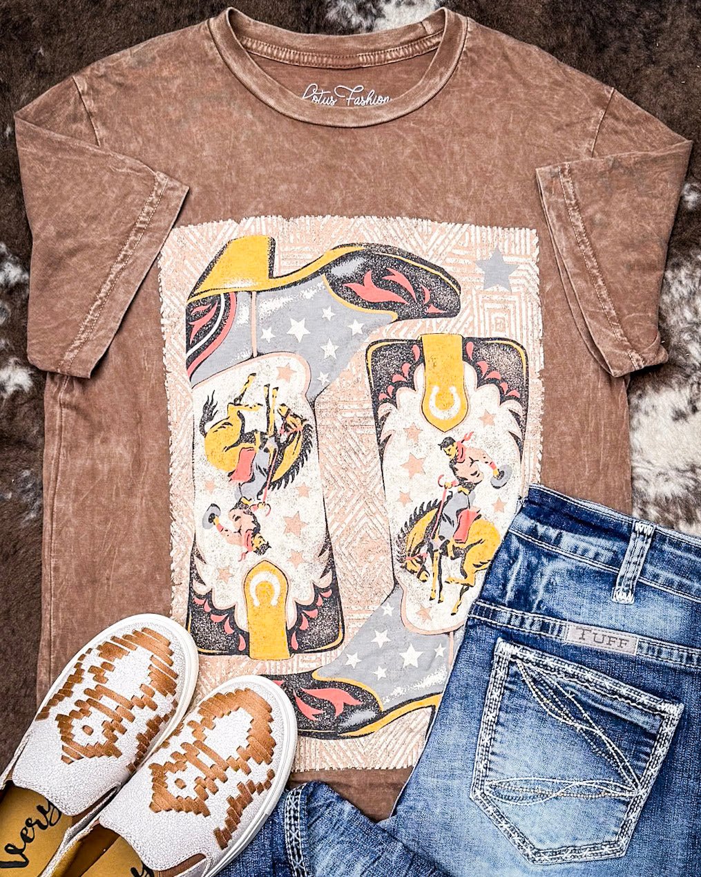 The Boots and Glory Graphic Tee brings all the retro rodeo charm with a modern western twist. Featuring a bold graphic of tall cowgirl boots decked out with bronc riders, horseshoes, stars, and a little attitude—it’s a wearable nod to the women who show up and show out.