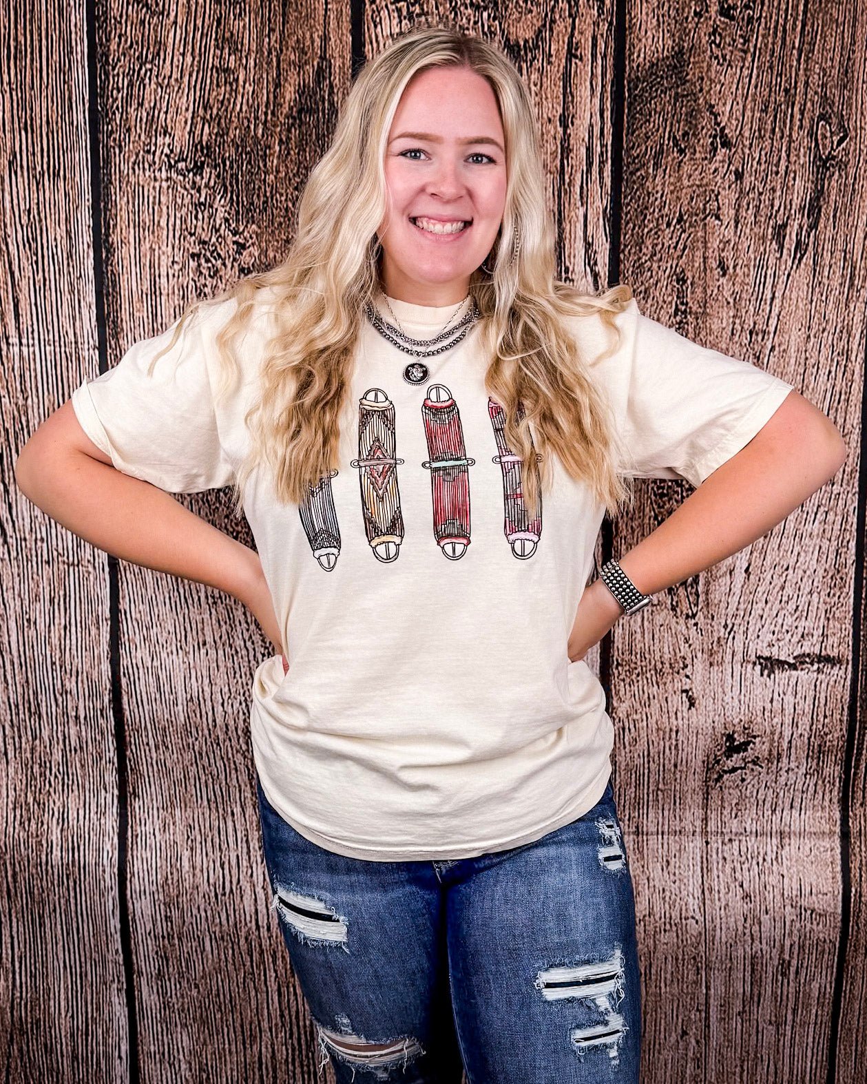 Set on a buttery-soft cream Comfort Colors tee, this shirt delivers all the laid-back vibes with an elevated nod to rodeo culture. The front graphic features five hand-drawn colorful cinches, each with its own detailed, woven design in earth tones, reds, teals, and browns. They line up across the chest like a badge of honor, perfectly imperfect and full of character, just like a real working ranch.