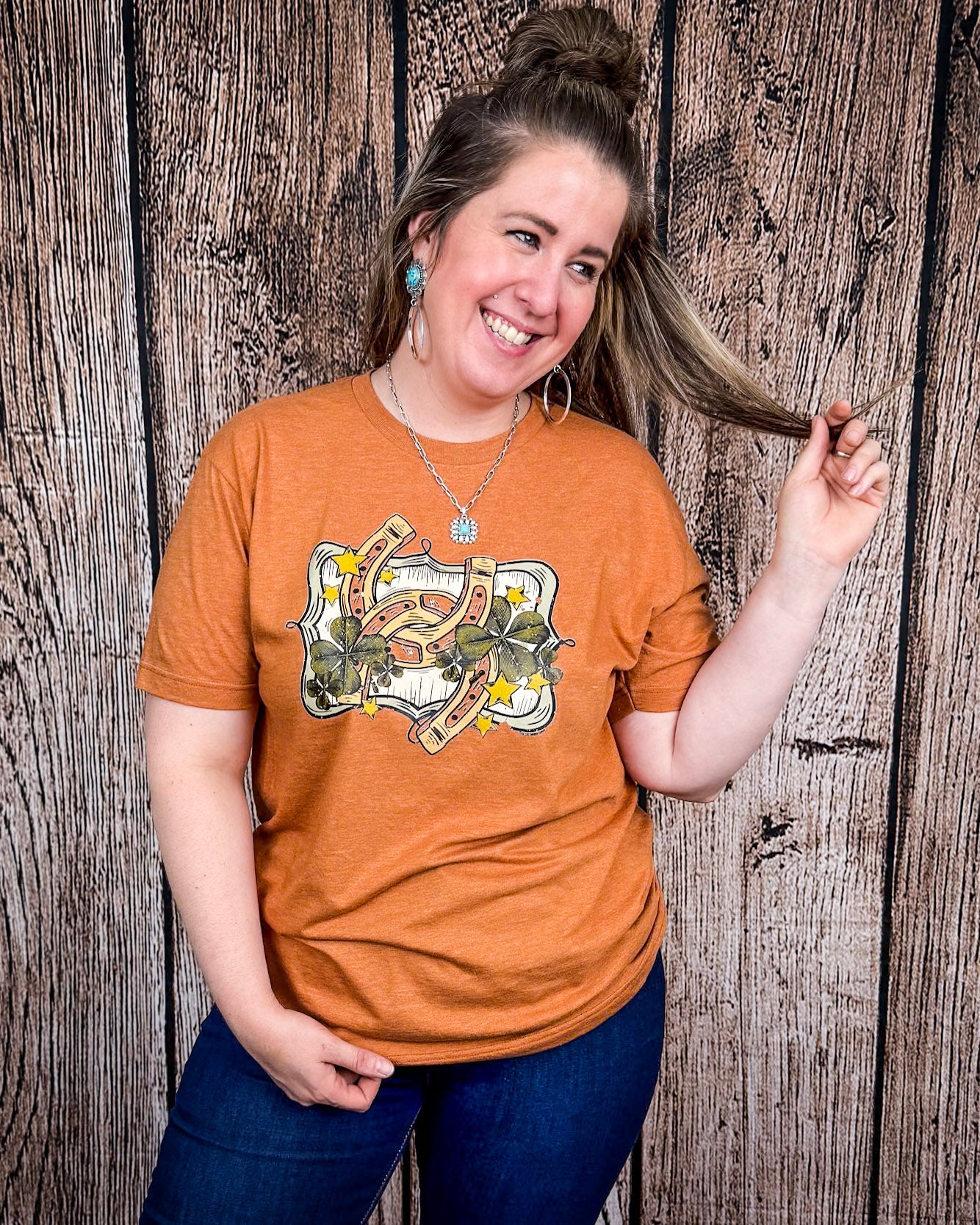 Some days just call for a little extra luck—and this tee’s packed with it. The Lucky Stars Graphic Tee brings a bold dose of good vibes, wrapped up in a western-inspired design that’s full of charm, grit, and just enough whimsy. Between the crossed horseshoes, twinkling stars, and clovers tucked in for good measure, this tee feels like your lucky token you can wear on repeat.