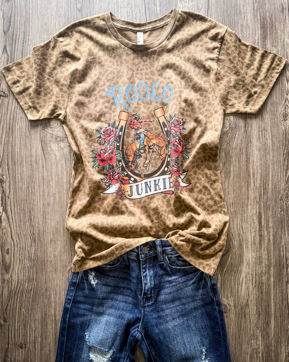 The Rodeo Junkie Graphic Tee in Brown Leopard is made for the cowgirl who lives for rodeo nights and western grit. Featuring a rich brown leopard print background, this tee showcases a bold vintage-style rodeo graphic with a bucking bronc rider framed by a lucky horseshoe and detailed roses.