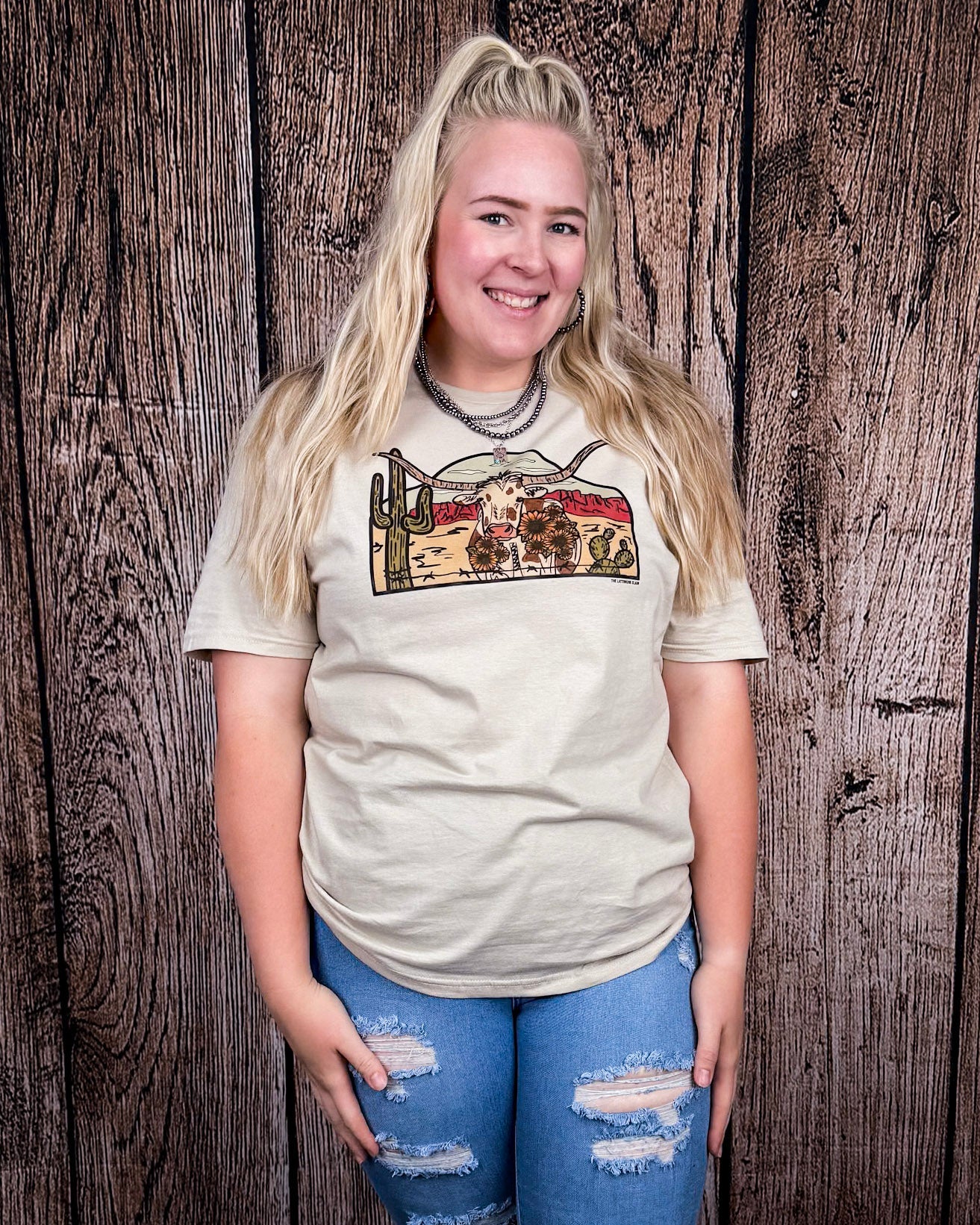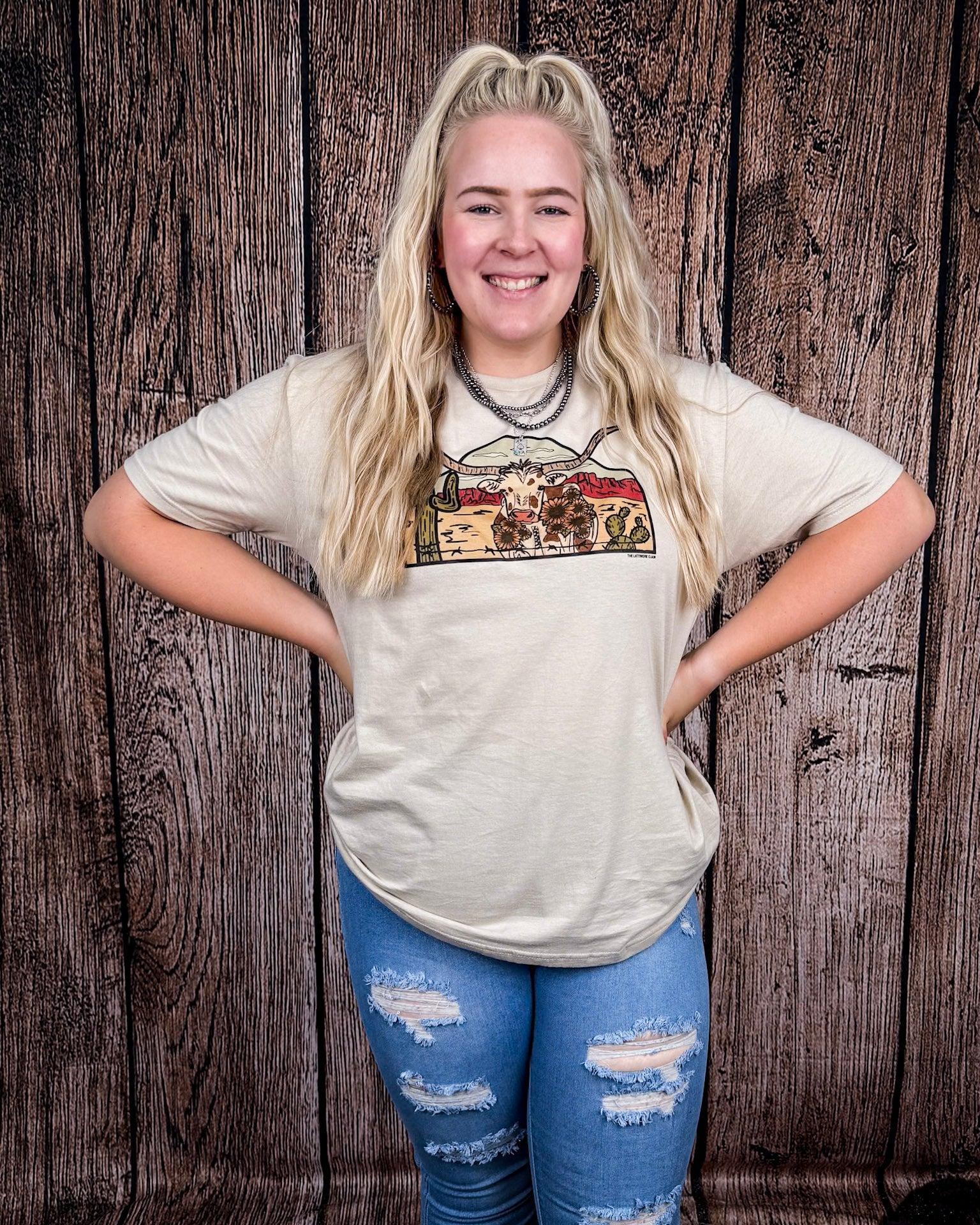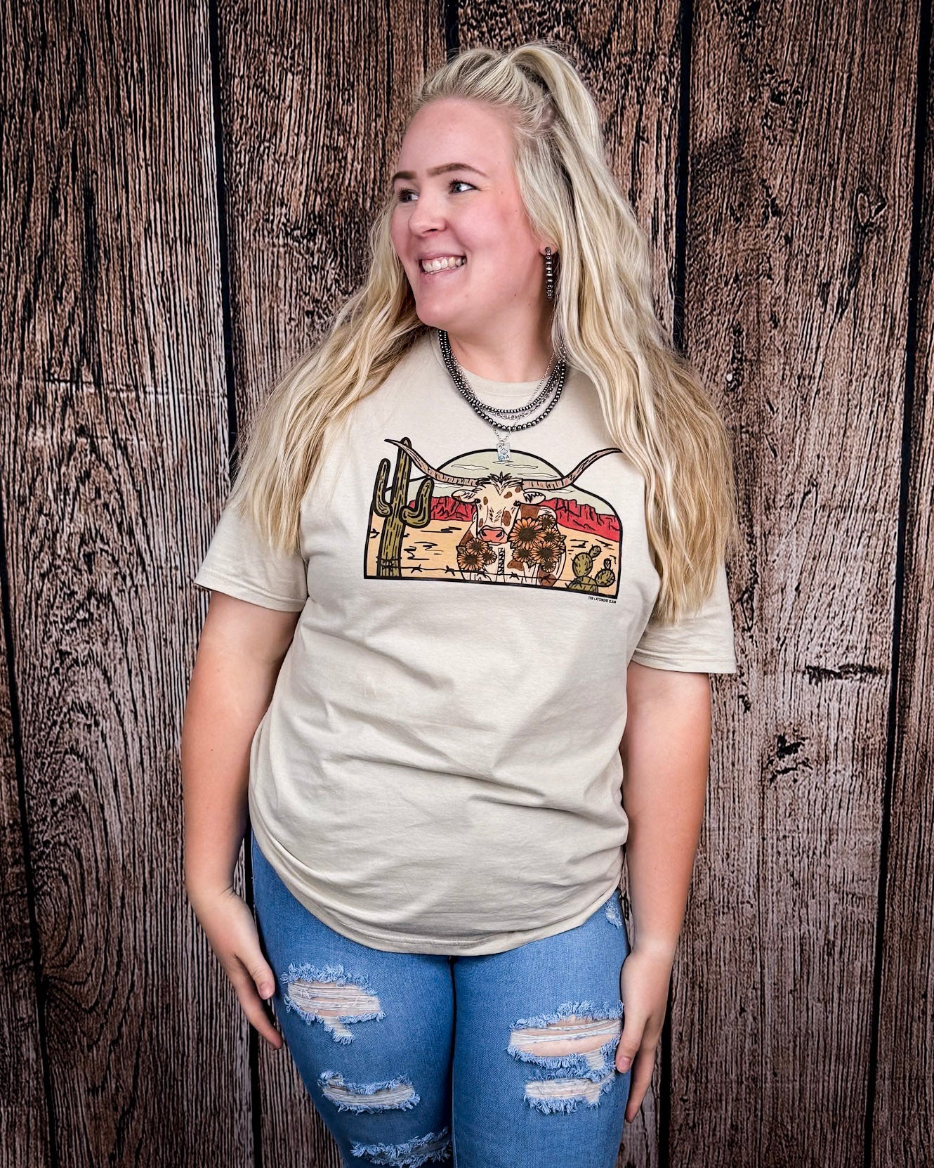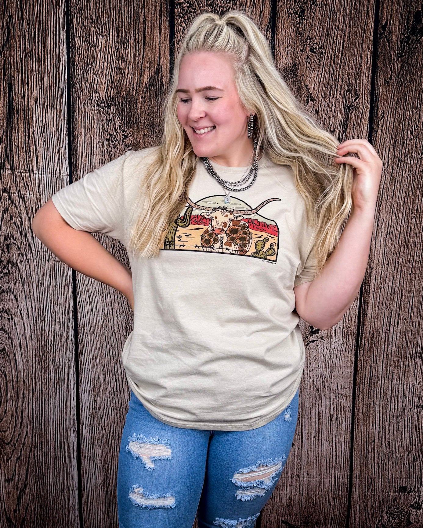 This graphic is full of texture and movement, like a snapshot from a dusty backroad drive—where wildflowers grow beside cacti and longhorns graze under a cotton candy sky. It’s bold without being loud, soft without being subtle, and effortlessly western without trying too hard.