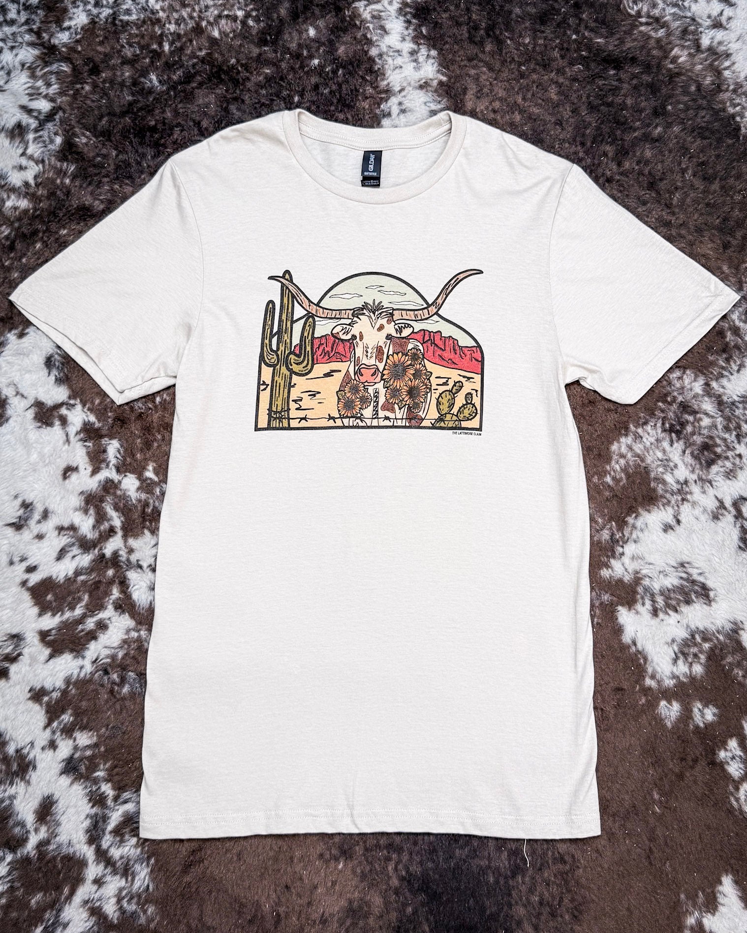 There’s something about the Texas Hill Country—wide open skies, warm desert light, and that untamed spirit you just can’t shake. The Laredo Longhorn Tee brings that feeling to life with a design that’s as soulful as the land it’s inspired by. From the hand-drawn longhorn front and center to the desert blooms and red rock buttes behind it, this tee is a true nod to the wild beauty of the Southwest.