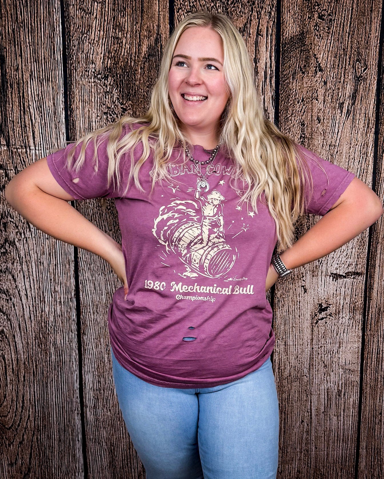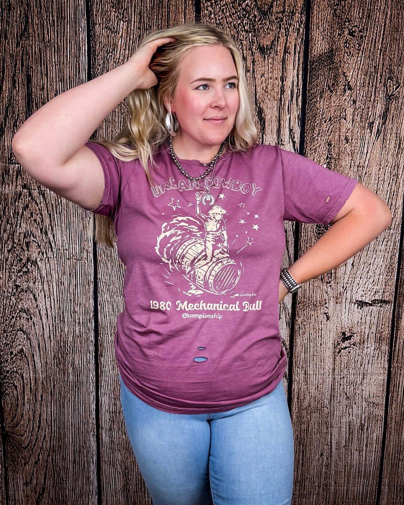 Washed in a rich vintage berry tone, this tee brings retro rodeo energy with a side of bold, big-city charm. The standout graphic says it all: a mechanical bull rider mid-spin, framed by stars and stamped with “1980 Mechanical Bull Championship.” It’s a little cheeky, a little nostalgic, and full of that throwback attitude that just works.