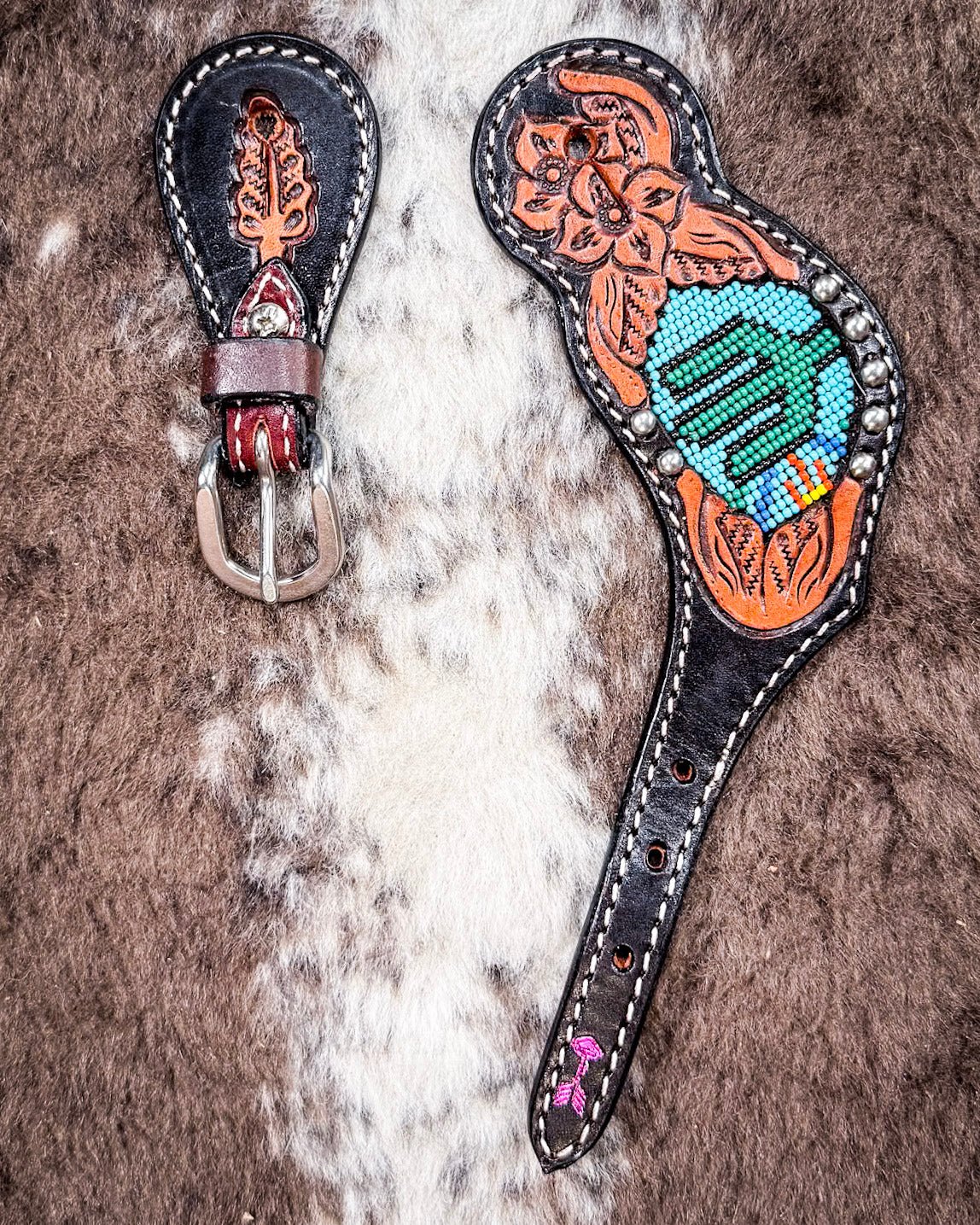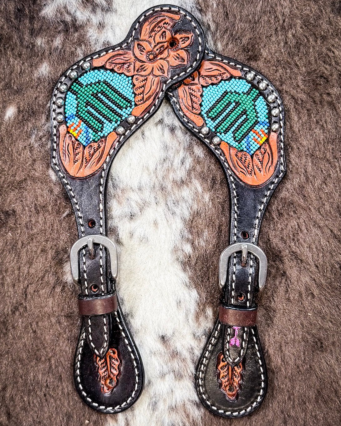 Rich floral tooling surrounds the beading on each strap, carved into warm chestnut leather that contrasts beautifully with the dark oil base. The tooling adds depth, softness, and a nod to tradition—all while keeping the look clean, feminine, and unmistakably western. Stud accents along the edge bring just the right amount of texture, tying the design together without feeling too flashy.
