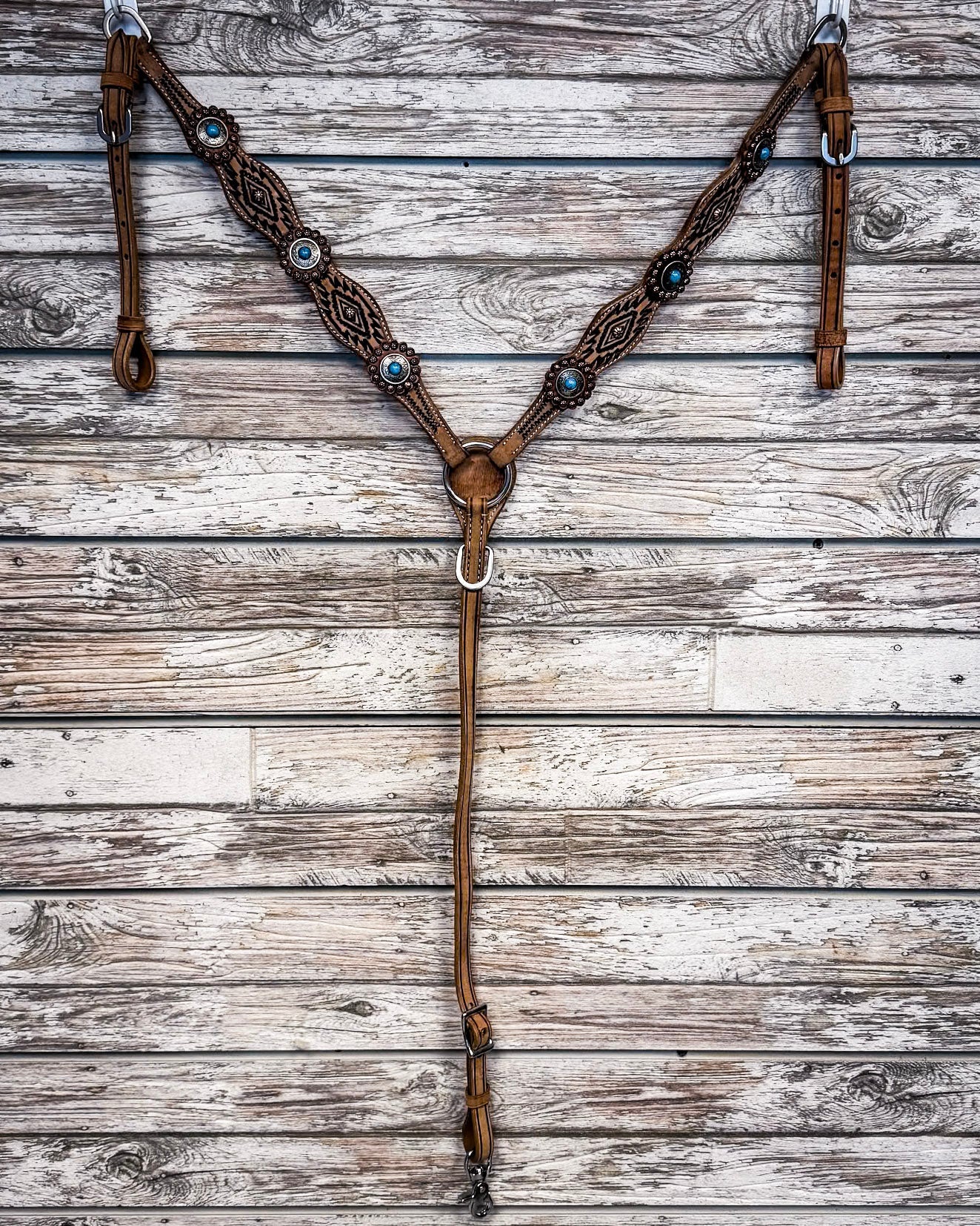 The Royal King Serenity Collection blends Southwestern artistry with show-stopping detail. Crafted from antique-finished leather, this tack set features deeply tooled geometric patterns and stunning silver conchos with large turquoise stones framed by copper dot edging. Both the browband headstall and matching breastcollar are designed for bold riders who appreciate both craftsmanship and comfort.
