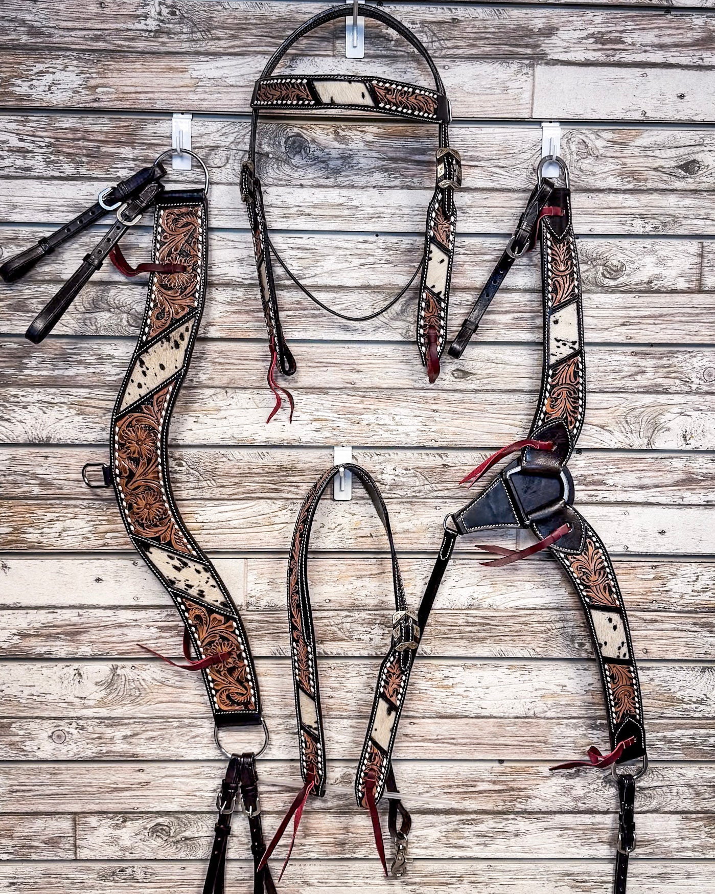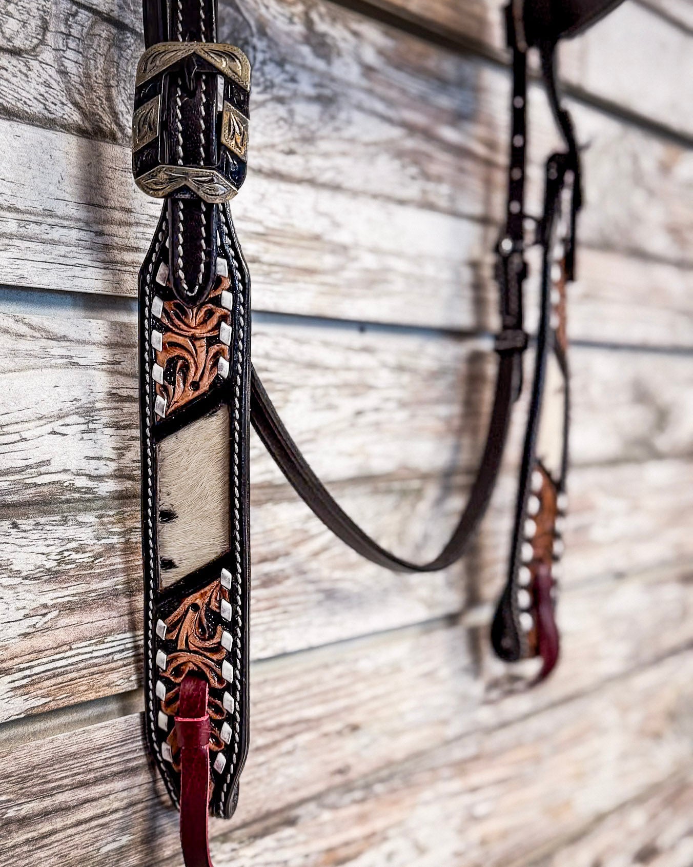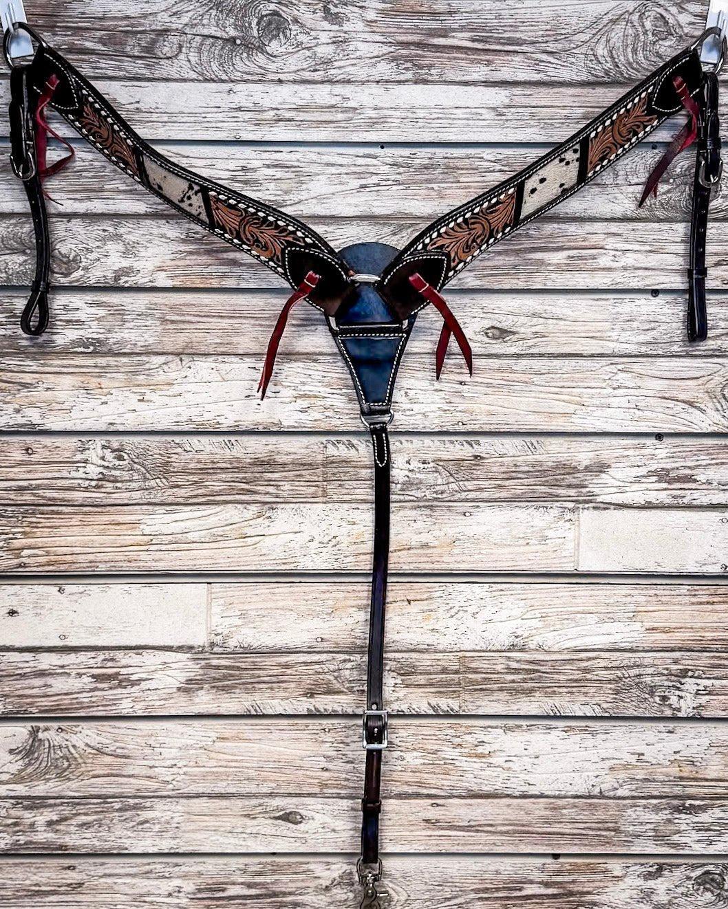 The Tough 1 Stampede Collection blends bold Western flair with traditional tooling for a rugged-yet-stylish look. Featuring rich two-tone hand-tooled leather and striking hair-on hide inlays, each piece is finished with crisp white buckstitching and latigo leather accents.