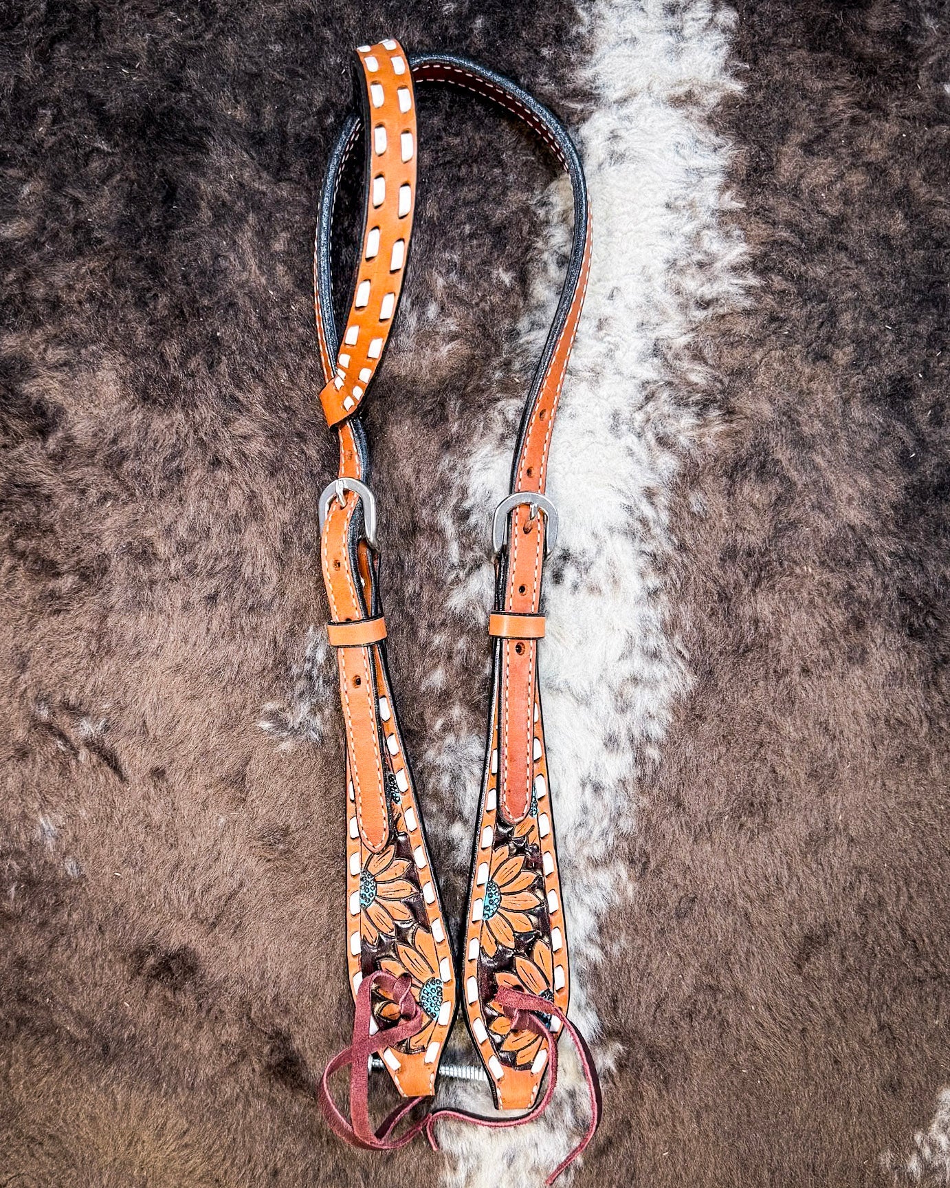 Let’s start with the look. Warm chestnut leather sets the stage for a vibrant sunflower design, finished with pops of turquoise that catch the eye without overpowering. It’s a perfect blend of classic floral style and fresh western flair—rich in color, full of texture, and easy to love. Whether you’re out for a weekend ride or gearing up for a show, this set brings a sense of fun and confidence to any setup.