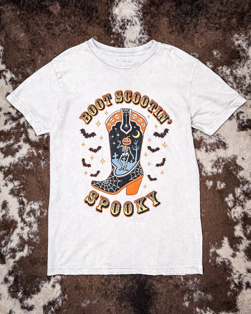 Meet your new favorite tee for pumpkin patches, bonfires, and two-steppin’ under the full moon. The Boot Scootin Spooky Tee brings all the Halloween vibes with a western twist—featuring a bold boot graphic filled with a dancing skeleton/jack-o’-lantern, spiderwebs, and bats. It’s festive without being too cheesy—and that's just how we like it.